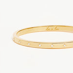 By Charlotte Live In Love Bangle in 18K Gold Vermeil. Illuminate your inner light with our Live in Love Bangle, designed as the ultimate elevated staple. This keepsake is engraved with the mantra "Live in love and light" and embellished with sparkling crystals, creating a radiant halo around your wrist. Elevate your style by layering this bracelet with others from our collection.