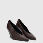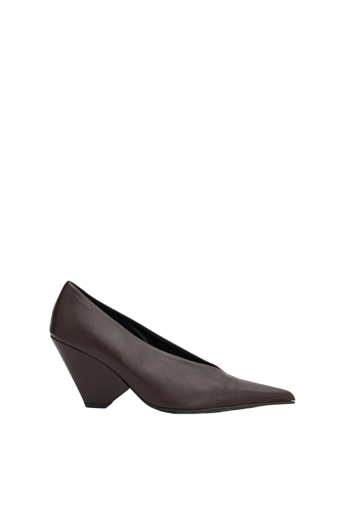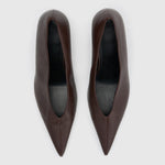 Camilla and Marc Rhys Leather Pump in Espresso. CAMILLA AND MARC Rhys pointed pump in espresso brown Nappa leather from Spain. Nubuck leather sole, angled 85mm heel. Made in Portugal.