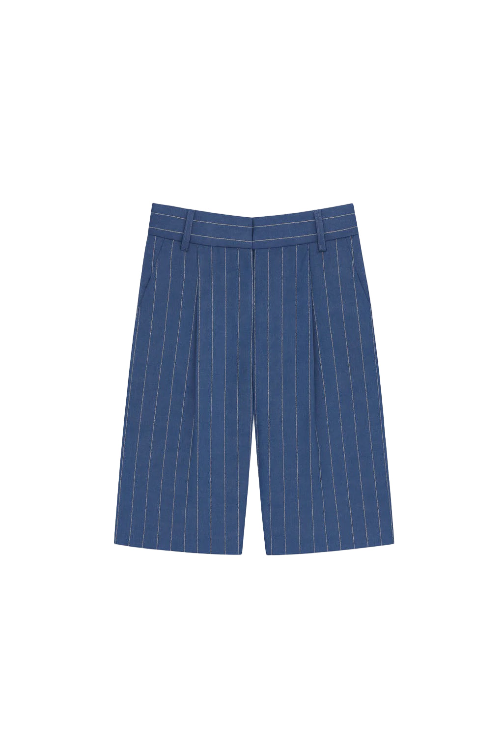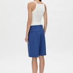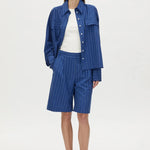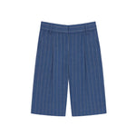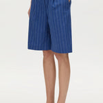 CAMILLA AND MARC Alberto mid-rise stripe tailored short in blue stripe. Permanent press down centre front leg, fly opening, slanted side pockets, back pockets with single button.