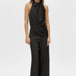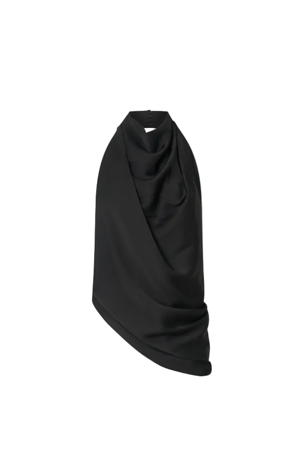 Camilla and Marc Elowyn Halter Top in Black. CAMILLA AND MARC Elowyn draped open-back sleeveless halter top in black. Neck button closure with lower back invisible zip. Asymmetric hem, georgette lining.