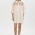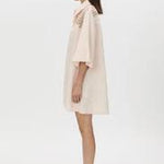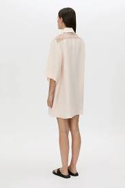 Camilla and Marc Lolani Dress in Soft Pink. The Lolani Dress is crafted from a linen blend in a short-sleeved mini silhouette. This dress features an embroidered circle motif and a dropped shoulder seam.