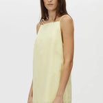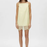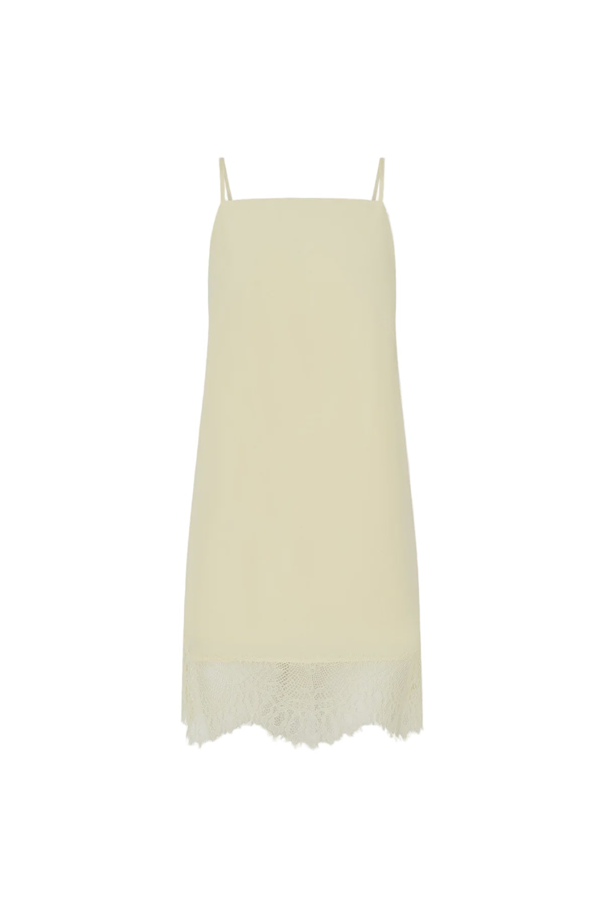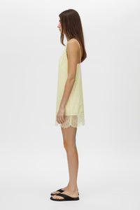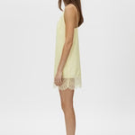 CAMILLA AND MARC Lira cotton-silk mini dress in yellow with wide chantilly lace hem trim. Rouleau straps with ring and slider for an adjustable fit. Side seam zip with hook and eye closure.