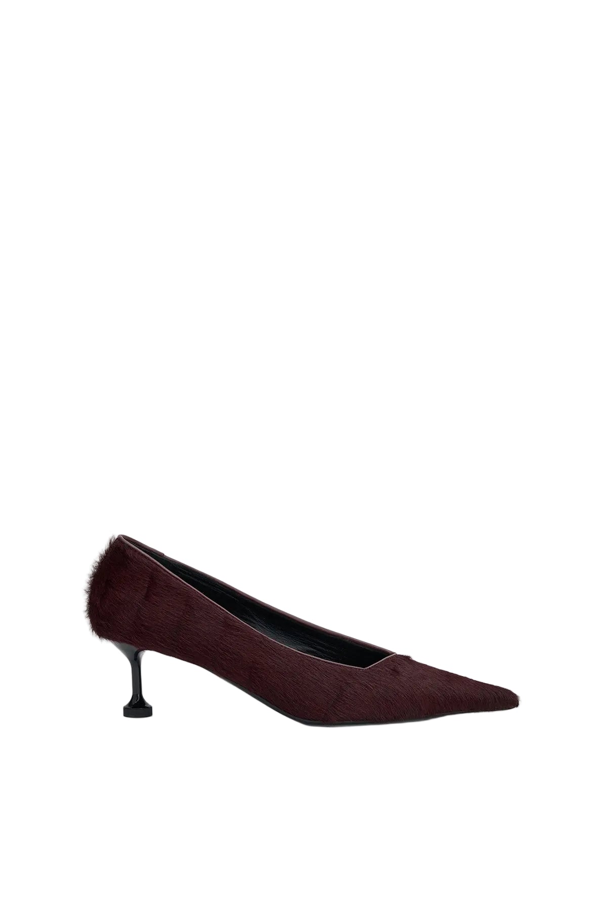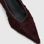 Camilla and Marc Siri Pony Pump in Burgundy. CAMILLA AND MARC Siri signature asymmetric low cut pointed pump in Italian cow leather. Croc burgundy motif. Black leather outsole, angled 60mm heel. Made in Italy.