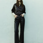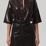 Citizens Of Humanity Frances Cropped Cape Button Up in Leather in Chocolate. The ‘Frances’ offers a directional take on the classic button-up, reimagined in buttery vegan leather with a subtle stretch for ease. Designed with a cropped silhouette and cape-inspired back detail, it balances sharp structure with modern edge. A bold staple—perfect styled with high-rise denim or tailored trousers.