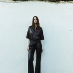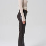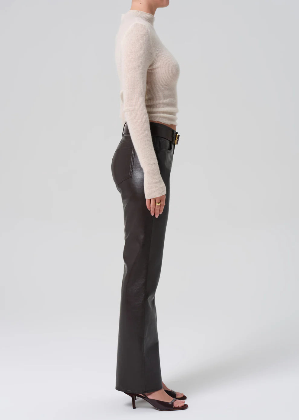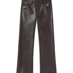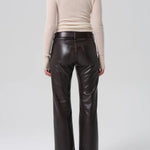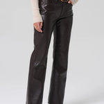 Citizens Of Humanity Genova Low Rise Boot in Leather in Chocolate Dark Brown. Citizens Of Humanity Genova Low Rise Boot in Leather in Black. A low-rise bootcut pant crafted from buttery recycled leather with slight stretch for ease. The silhouette fits true to size and falls to a full-length bootcut, offering a luxe, modern take on leather pants. Finished in rich chocolate, it’s a versatile style for both day and evening looks.