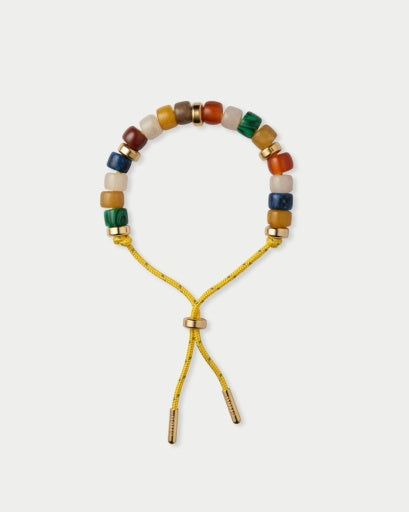The Eliou Millie Bracelet in Autumn is handmade in éliou’s studio from hand-selected gemstones — yellow jade, malachite, quartz, carnelian, and lapis lazuli — strung in a warm, earthy palette and interspersed with 18k gold-plated rondelle beads. Each stone is chosen for its individual character, so no two pieces sit quite the same on the wrist. Designed as an adjustable unisex bracelet, it slides comfortably on its own or layered with your other éliou favourites for a quietly considered, everyday stack.