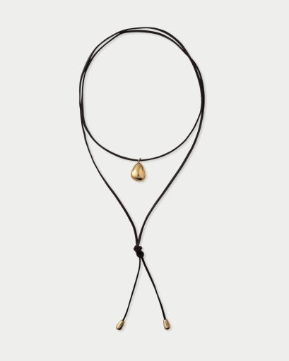 The Eliou Nitta Wrap in Gold Plated is a sculptural take on the classic drop pendant, set on a soft brown leather cord that’s long enough to wrap, knot or layer however the moment calls for. The pendant itself is a quietly architectural drop in 18k gold over recycled brass — polished, organic and weighted just so against the chest.