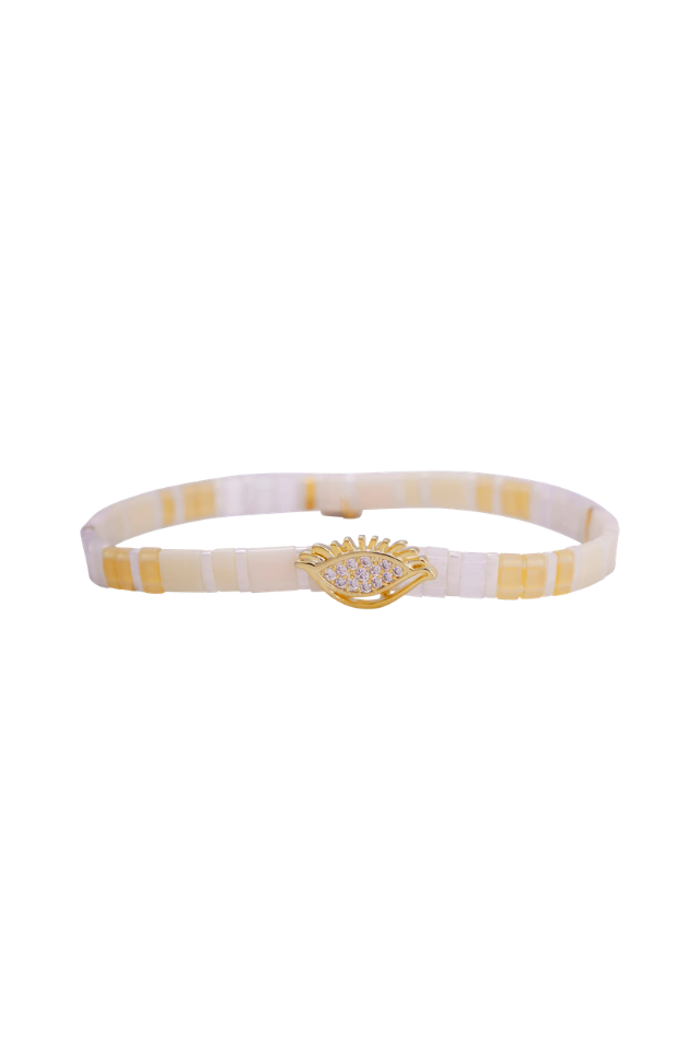 Fairley Eye Of Marrakesh Bracelet. Inspired by the mystique of Moroccan souks and the protective power of ancient talismans, the Eye of Marrakesh Bracelet features a crystal-encrusted evil eye designed to ward off negativity and attract good fortune. Set on a delicate chain, this striking piece blends old-world symbolism with contemporary elegance, making it perfect for stacking or wearing solo as a statement of spiritual style.