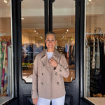 Harris Wharf Cropped Trench in Tan. Double-breasted croped trench coat, unlined in light technic fabric.Short jacket with long wide sleeve and double-breasted fastening featuring a notched lapel and side-seam pockets. Raw-edge finish.Made in Italy with Japanese fabric.