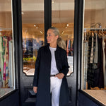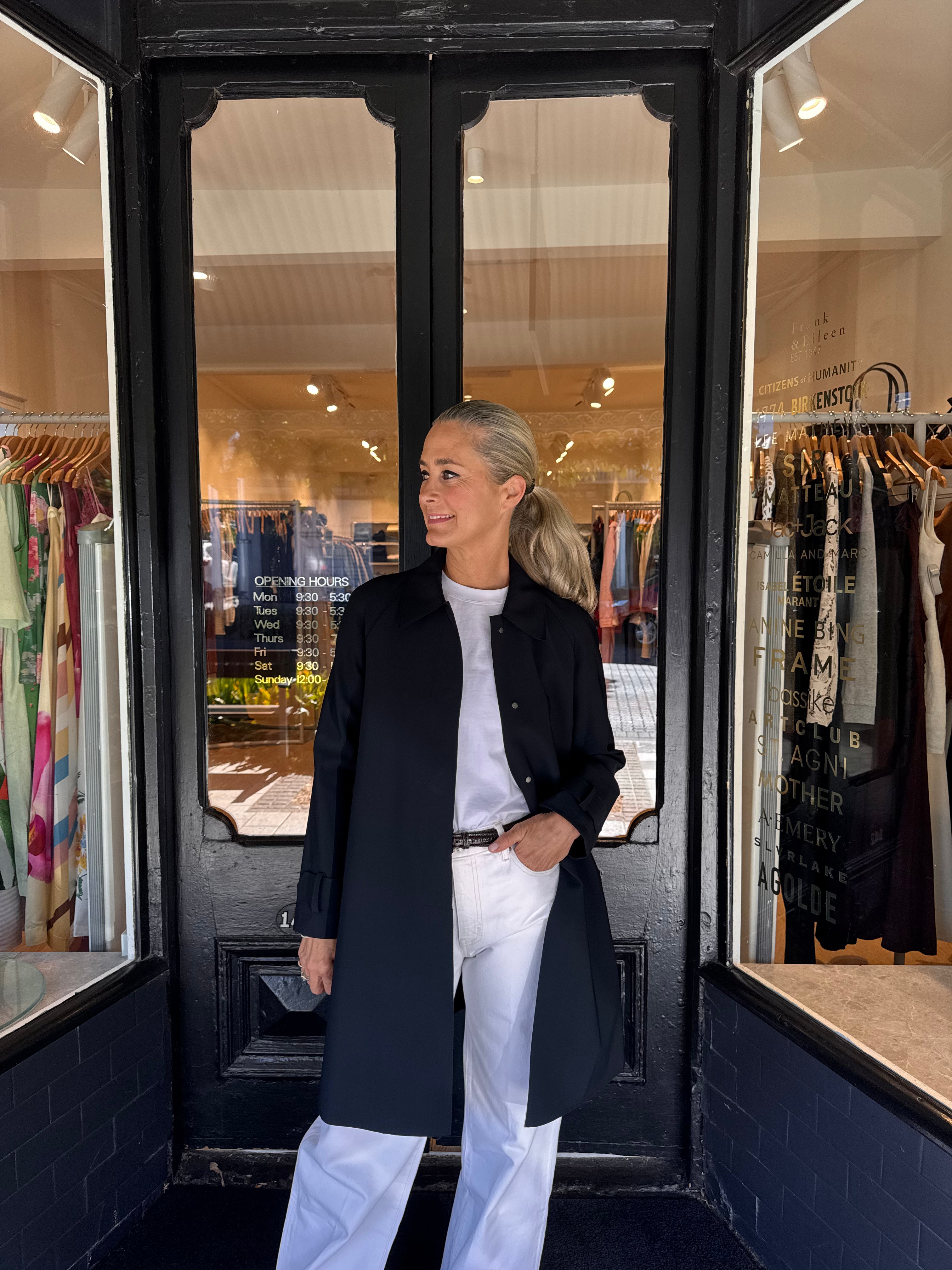 Harris Wharf Mac Coat in Black Scuba. Mac coat, unlined in knitted technic scuba fabric. Mid-length A shape coat with raglan long sleeve featuring 4 snap buttons closure and welt pockets. Raw-edge finish.Made in Italy with Italian fabric.