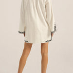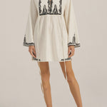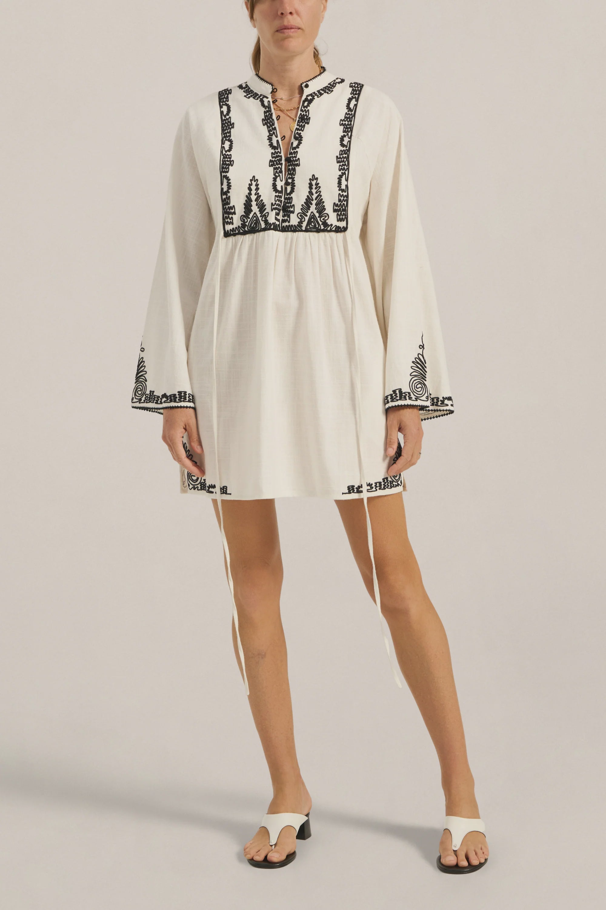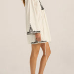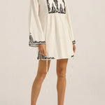 The Ilio Nema Cyclope Tunic in Dori Embroidery. The Cyclope Tunic is cut from soft cotton slub fabric in a clean white, finished with intricate black Dori embroidery across the bodice, cuffs, and hem. Created with precision, the manually applied cording delivers a richly textured and tactile embroidery finish, giving the piece depth, dimension, and artisanal character. It sits in a short, gathered silhouette with long flared sleeves, a V-neckline with a delicate tie closure, and side slit ties that allow for easy layering over a swimsuit or worn alone as a mini dress. The Cyclope Tunic is a piece that moves between the shore and the table with equal ease.
