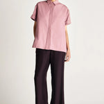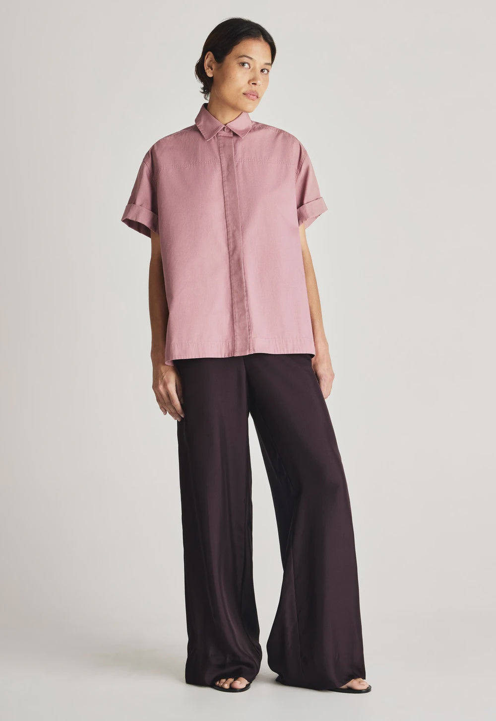 Jac and Jack Seta Pant in Auber. Combining the sophistication of tailored elements with a relaxed wide leg shape, these full-length pants are crafted from a floaty silk twill and showcase a minimal waistband with an elasticated back. Tuck in a simple tank or wear a matching silk Tatum Shirt for an easy yet elevated ensemble.