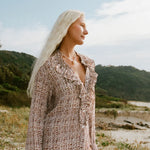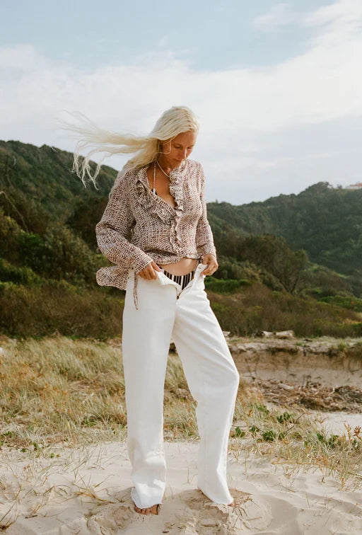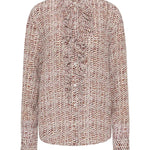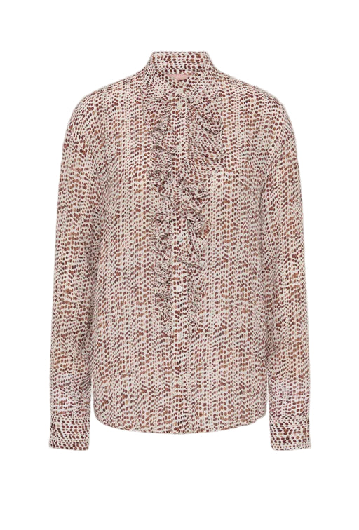 Maggie Marilyn For the Frill of It Shirt in Polka Dot Shell. A elegant yet playful shirt that pairs perfectly with a suit pant or loosely tucked into white denim. An archive MM silhouette that's been reimagined in a slightly shorter style, with soft ruffle detailing down the front. Size down for a slimmer fit. Model is 175cm wearing a size S/8.