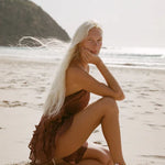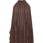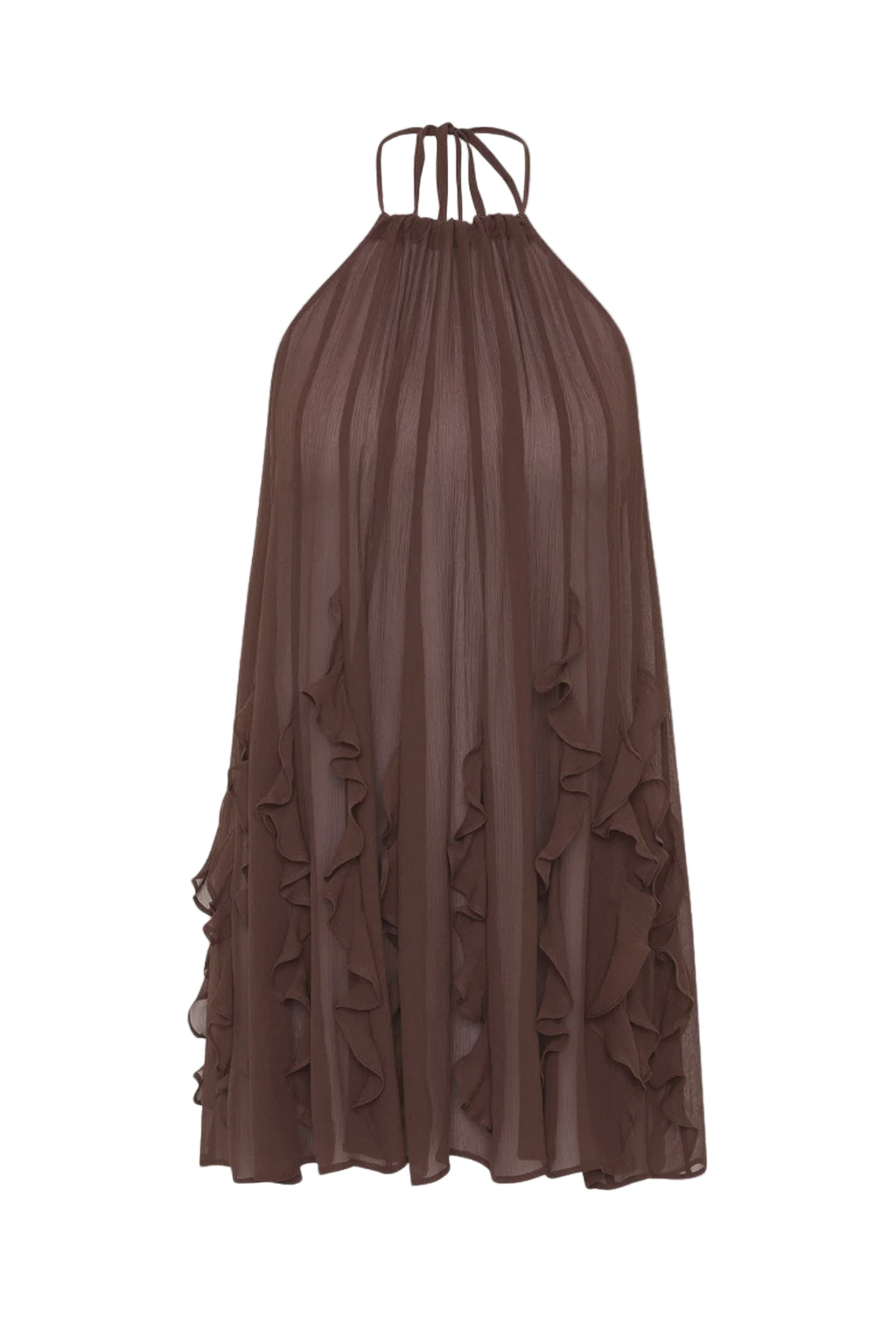 Maggie Marilyn Jellyfish Ruffle Mini Dress in Chocolate. A tunic top crafted in a rich tiramisu sheer silk crepe, with a halter tie strap and a voluminous mini skirt made up of cascading, wavy ruffles. Perfect as a cover-up over swimsuits and with summer denim.