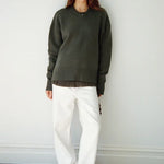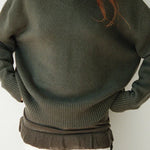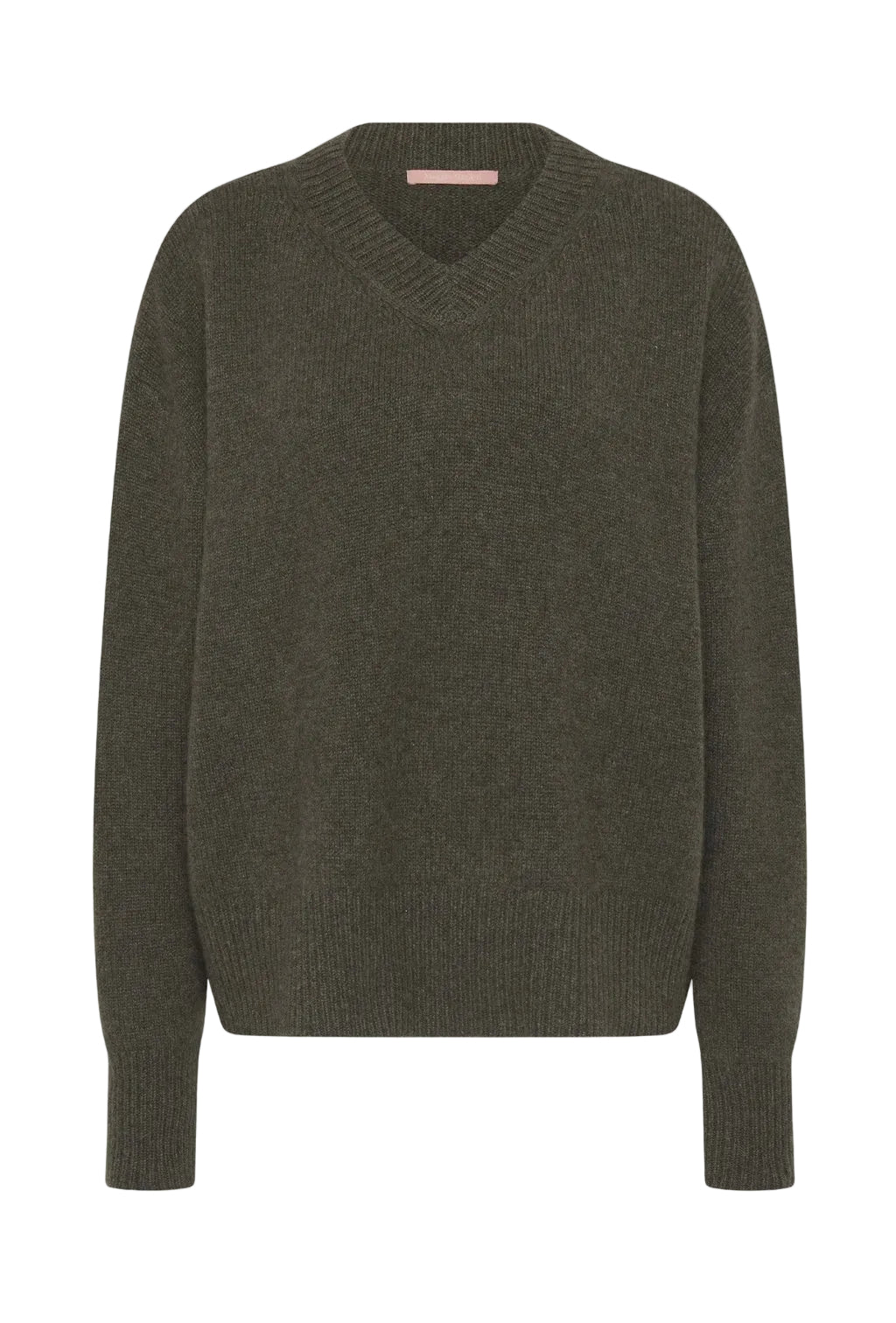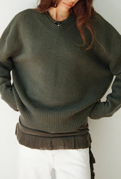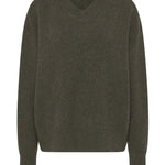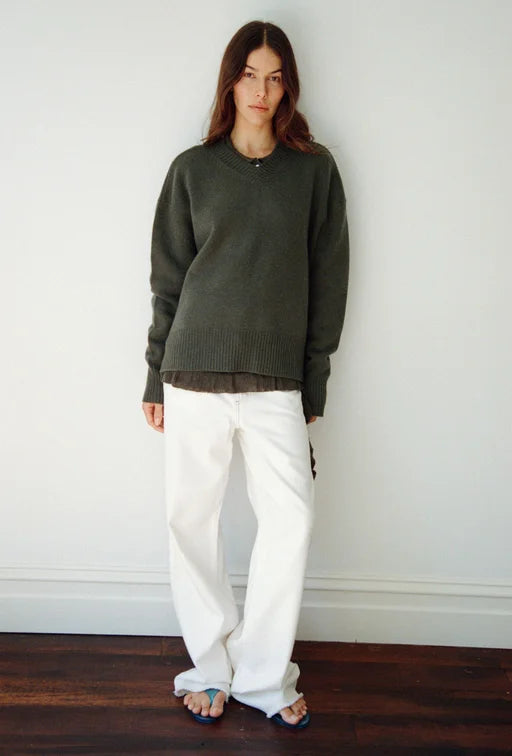 The Maggie Marilyn Just Between Us Sweater in Driftwood Green. An oversized high V-neck sweater in a thick luxurious cashmere, with flattering dropped shoulders and elongated sleeves. Style over a white Mini T-Shirt and pair with Forever denim for high wardrobe rotation.