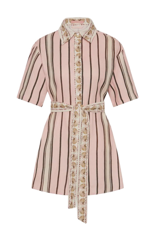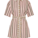 Maggie Marilyn Just Getting Good Shirt Dress in Neopolitan Ice Cream Stripe. The Just Getting Good Mini Shirt Dress is crafted in linen with our signature stripe print.The dress has a collared neckline, a button-down front and a cinched tie-waist. Designed to wear with your swimwear or the matching Straight Talker Mini Shorts. Model is 175cm wearing a size S/8.