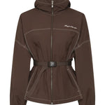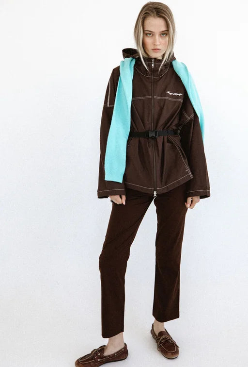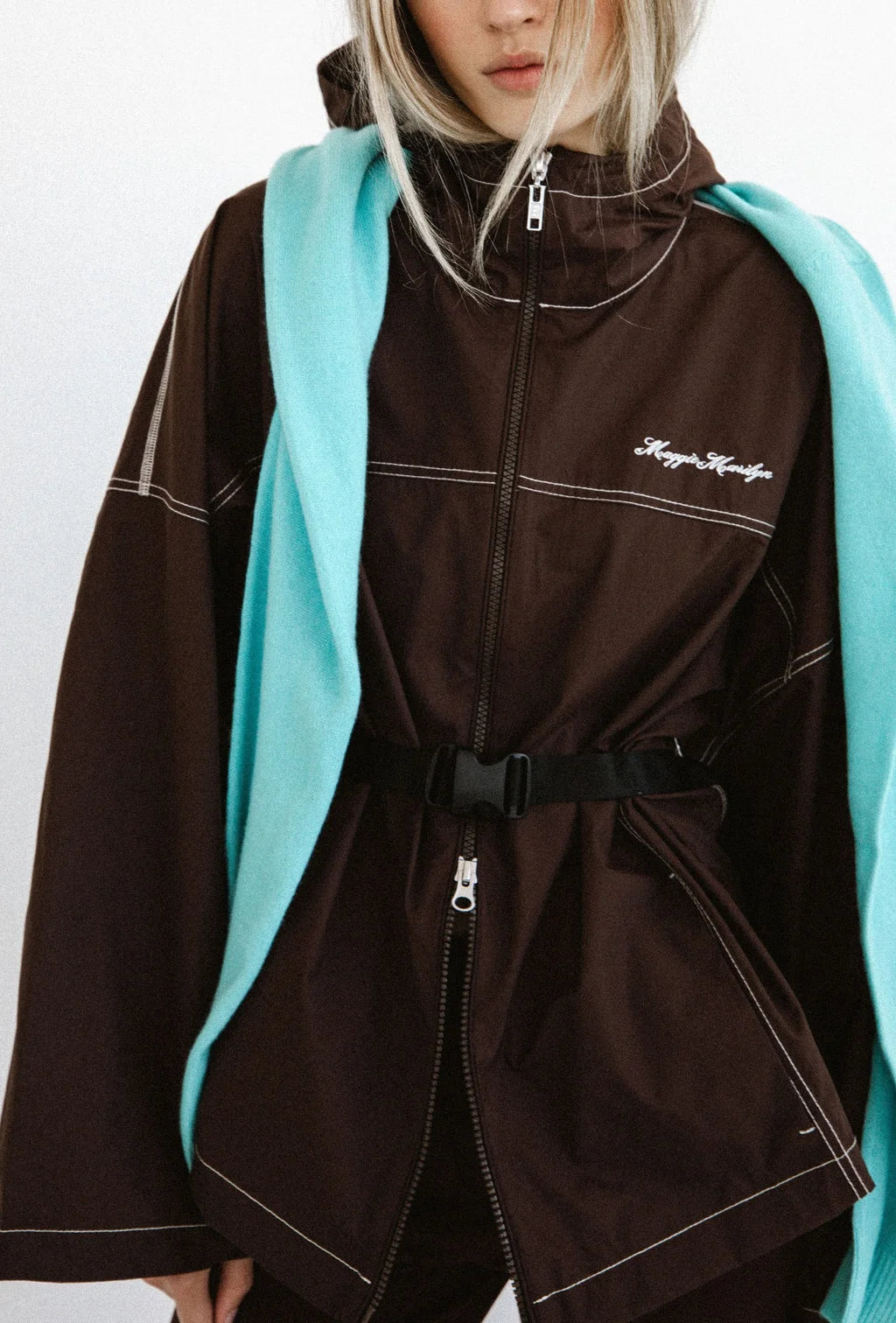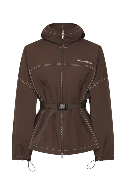 Maggie Marilyn Light at the End of the Tunnel Windbreaker in Chocolate. Designed for wind that bites and ocean spray, this lightweight windbreaker in chocolate brown features an embroidered Maggie Marilyn logo on the front, a full zip and buckle-belted waist. For a relaxed fit we recommend taking your regular size or sizing down for a closer fit. Model is 173cm and wearing a size S.