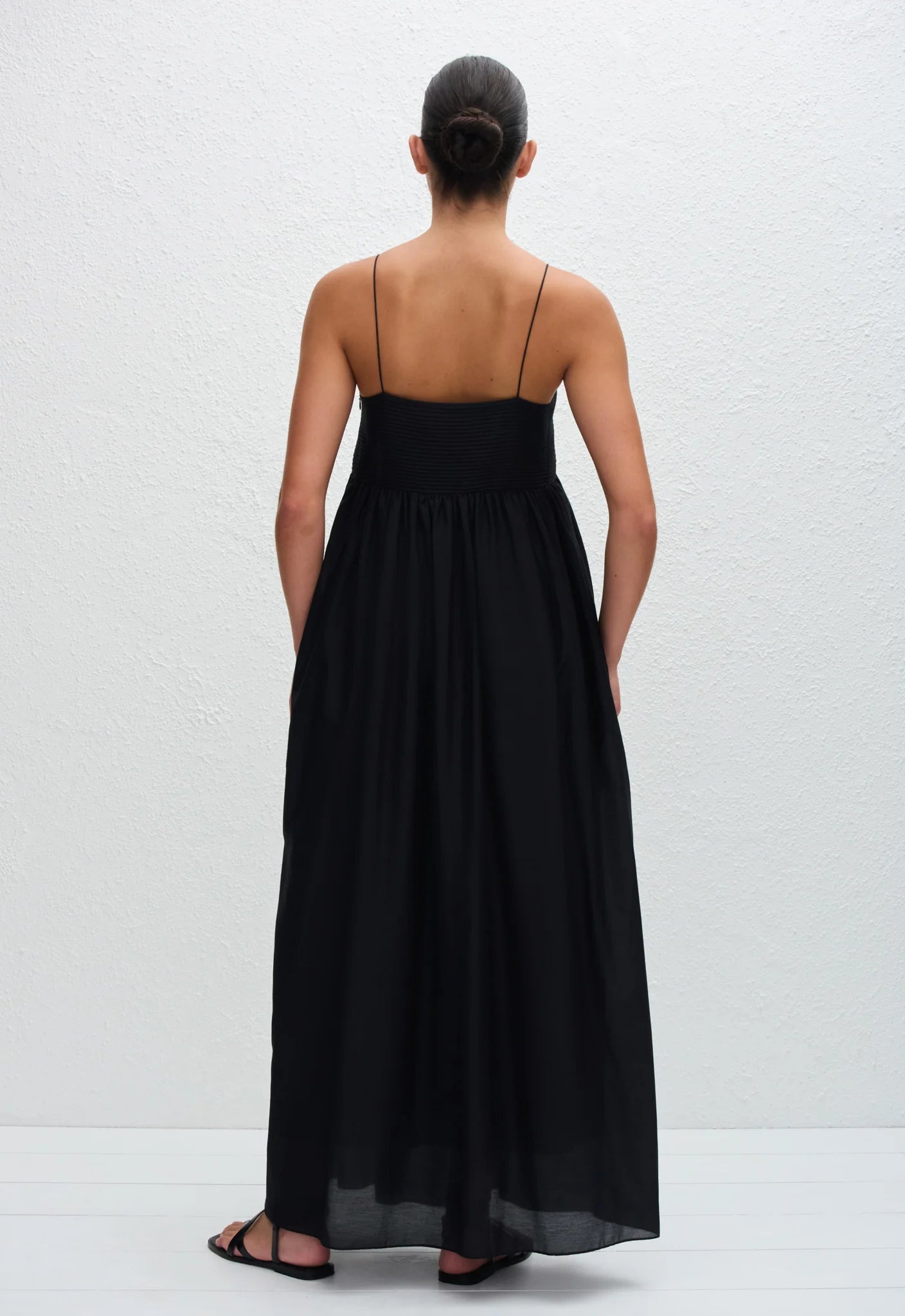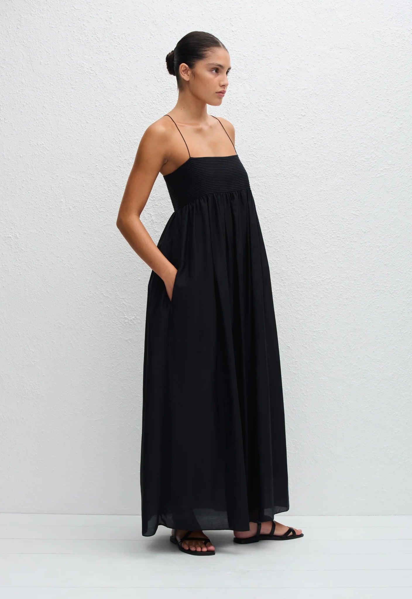 The Matteau Empire Pintuck Bodice Dress in Black. Introducing the Empire Pintuck Bodice Dress, an effortlessly elegant dress silhouette. Delicately crafted from our organic cotton-silk voile, this midi length dress features a gathered bust detail and empire waist line that extends into a flowing, full skirt. Style with strappy sandals for celebrations and long lunches under the sun.
