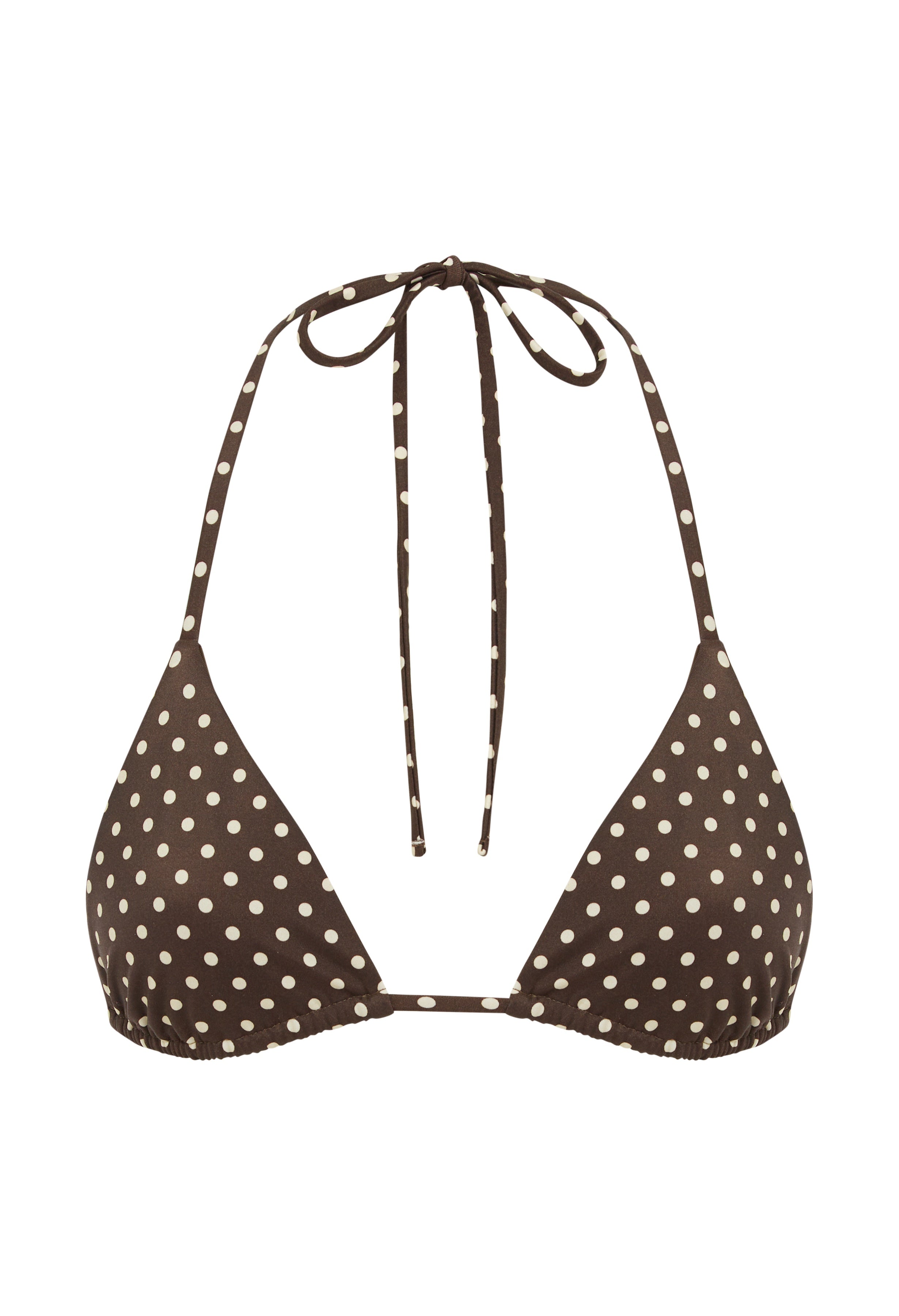 The Matteau String Triangle Top in Chocolate Polka Dot. Always in style, this classic triangle top offers medium coverage, with self-tie string straps. Fully lined and made from recycled nylon and elastane, with seamless finishings.