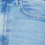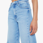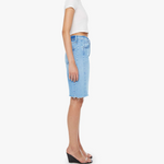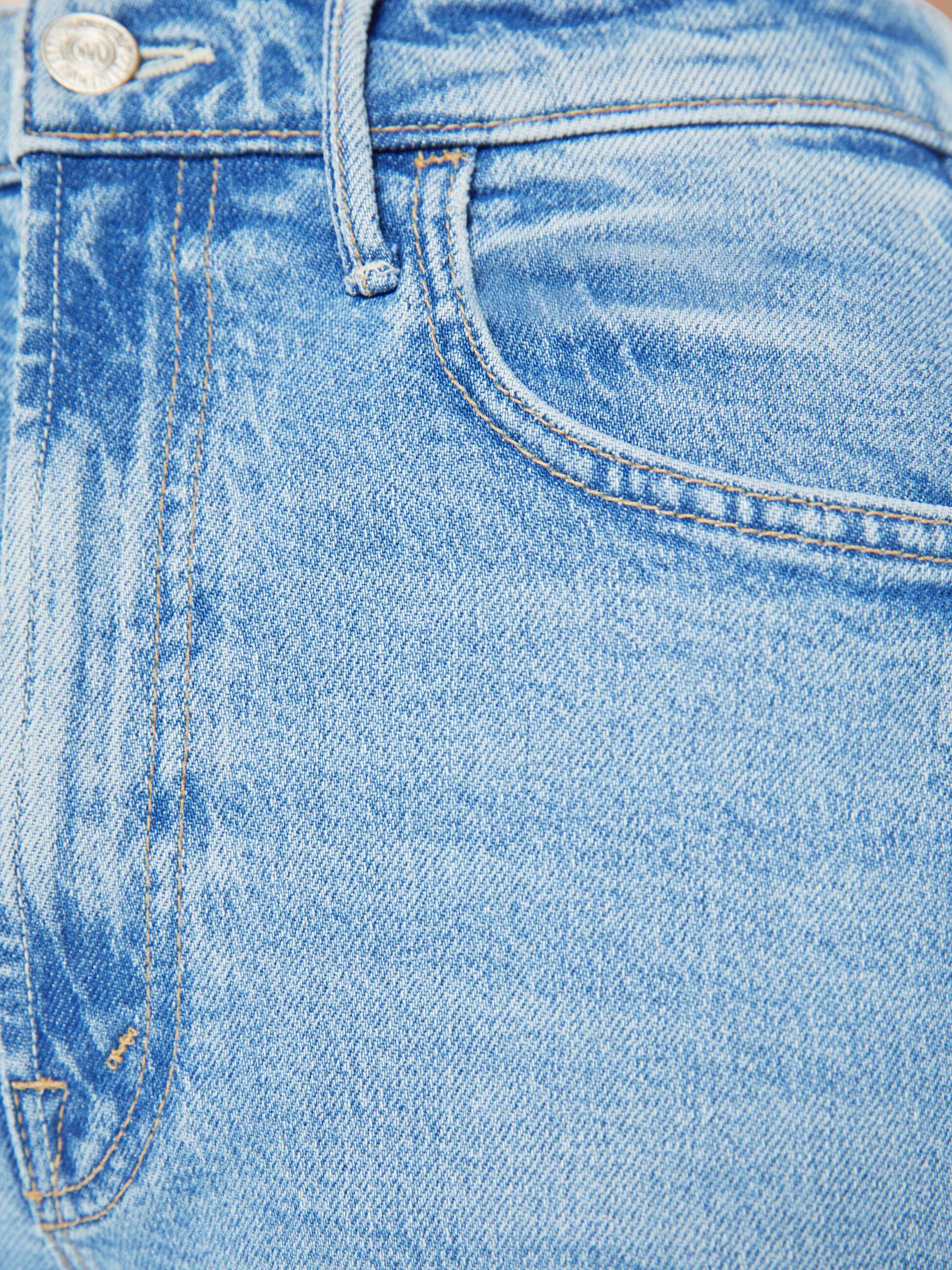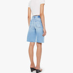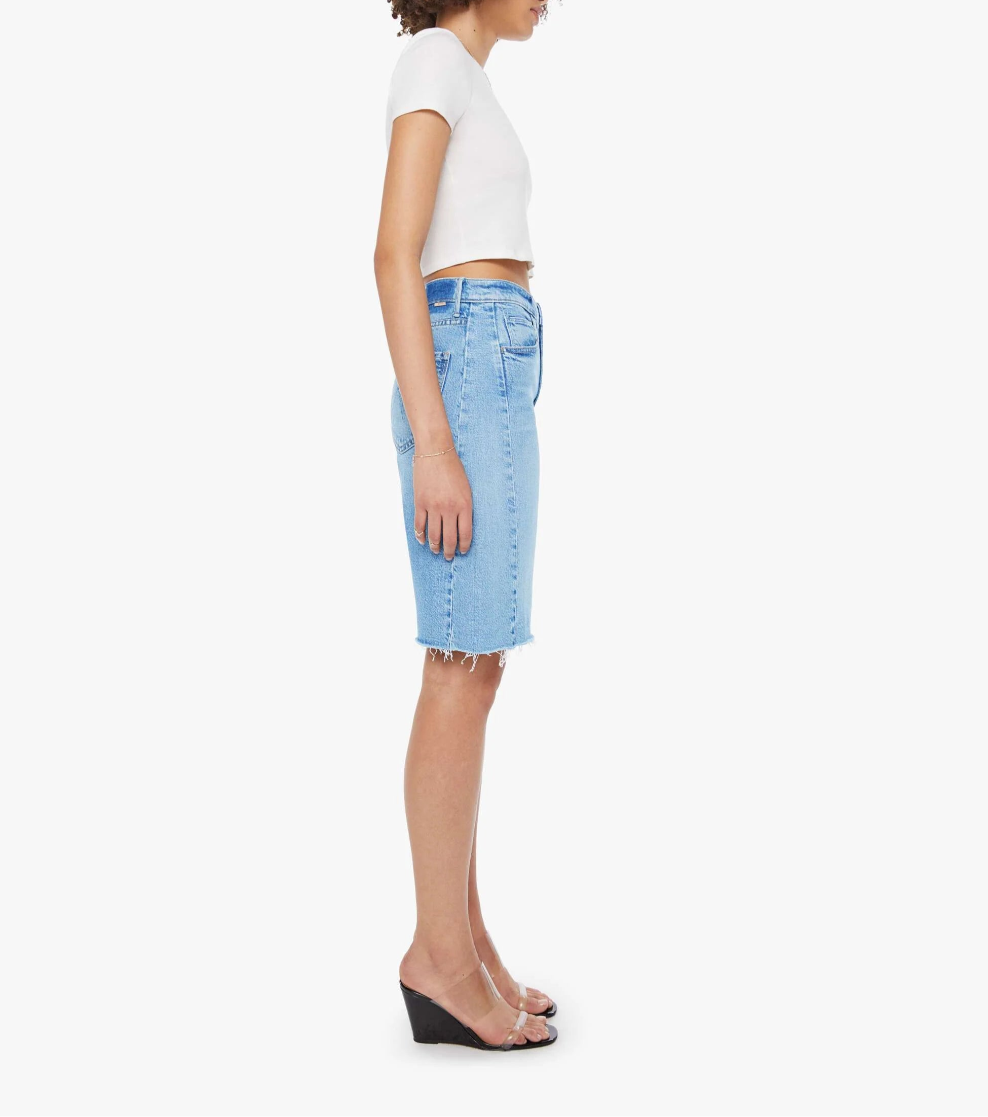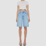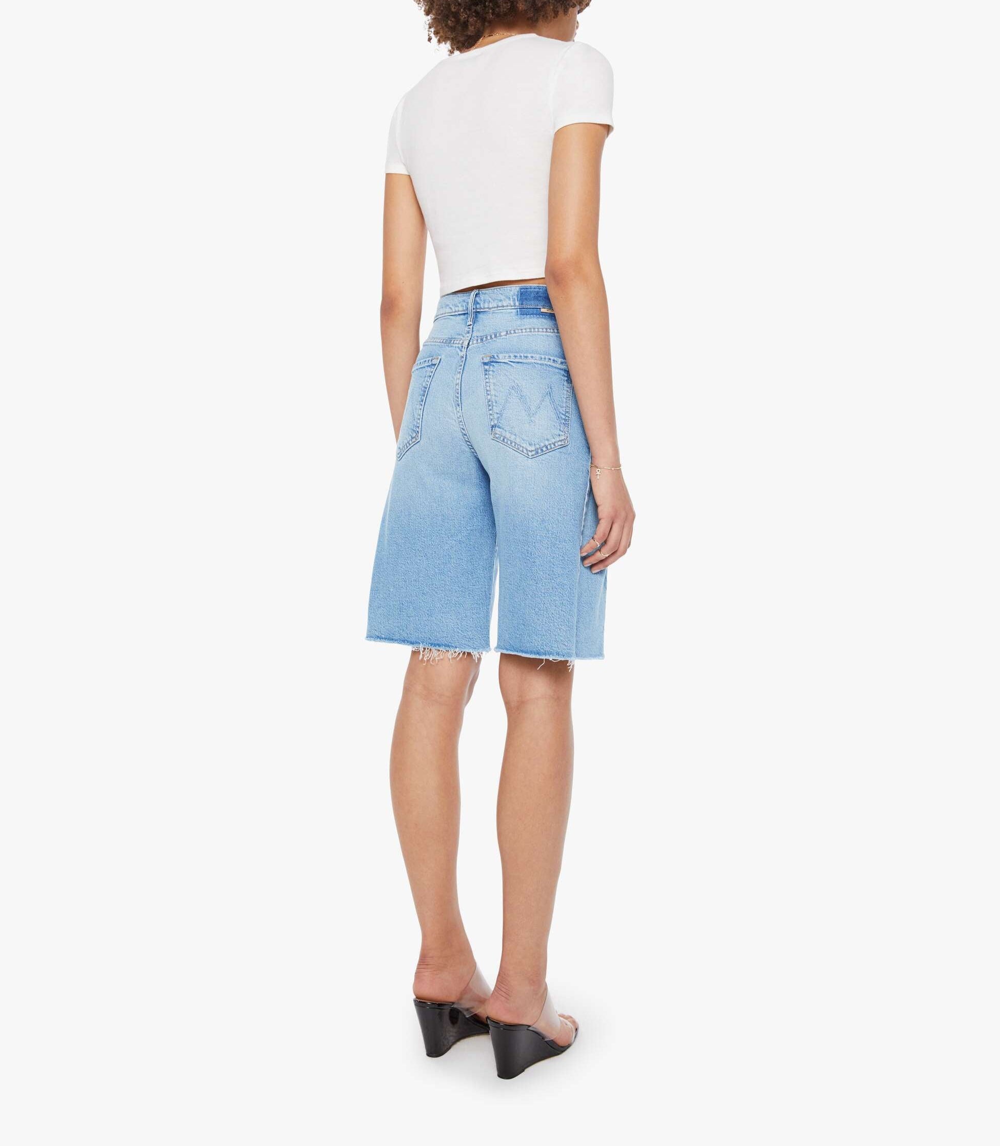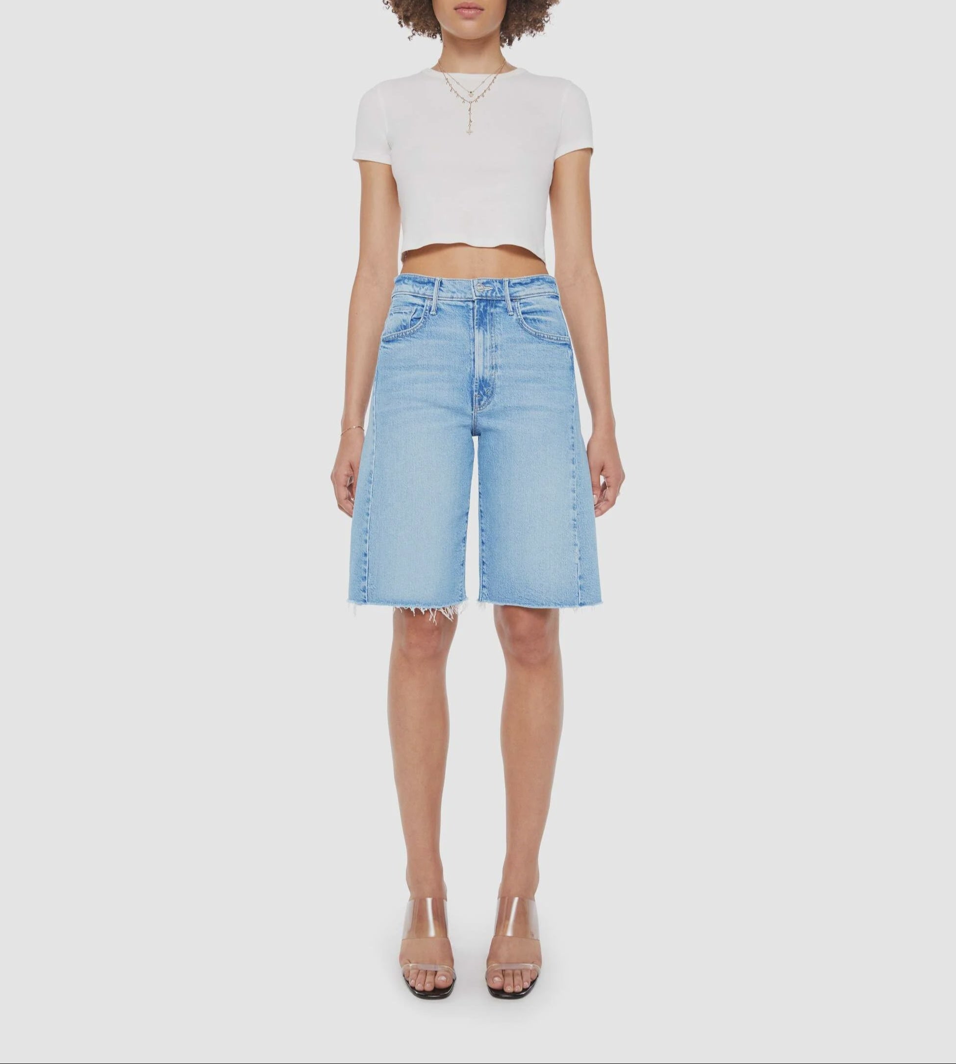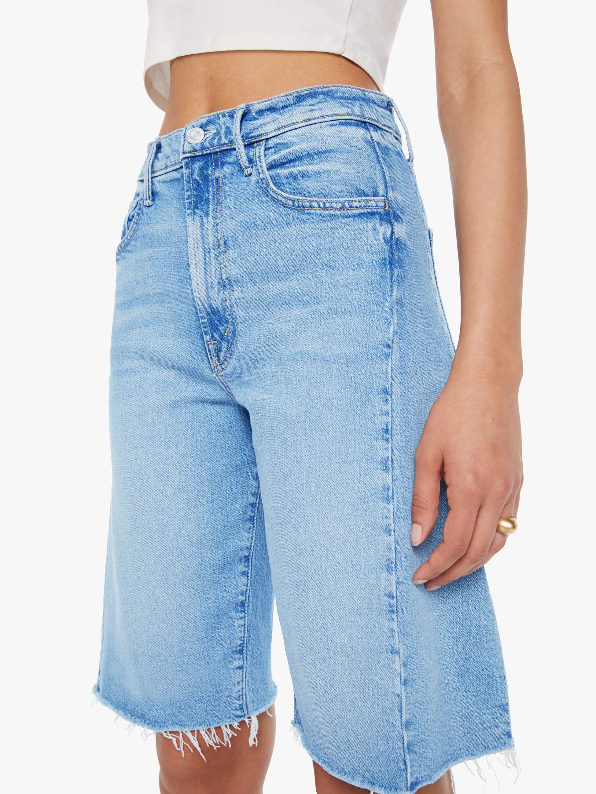 Mother Half Pipe Bermuda Fray in Sow Surreal. Super high-waisted Bermuda shorts with a wide leg, knee-length inseam and a frayed hem. Cut from semi-rigid SUPERIOR denim, Sow Surreal is a light blue with whiskering and fading throughout.