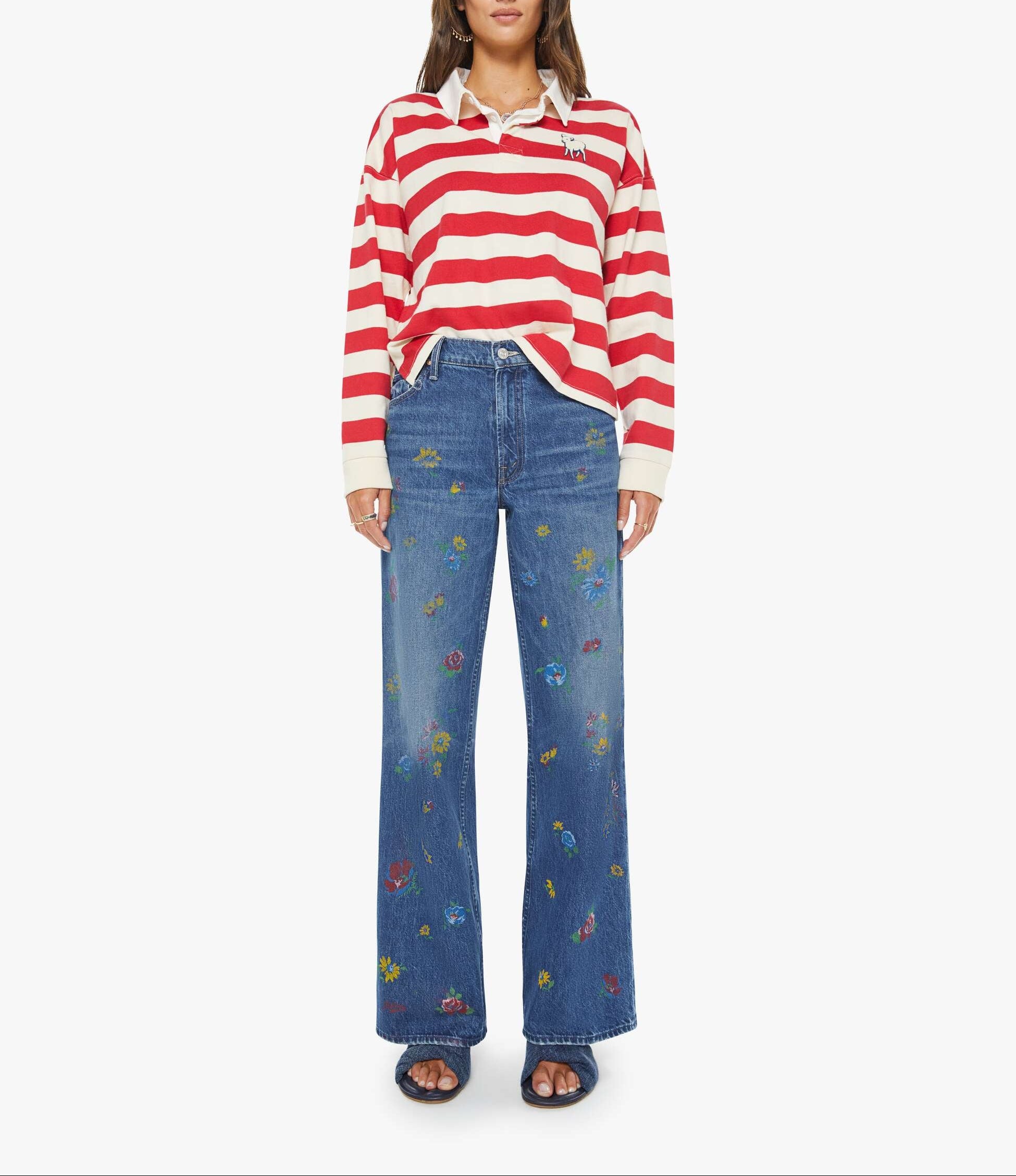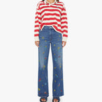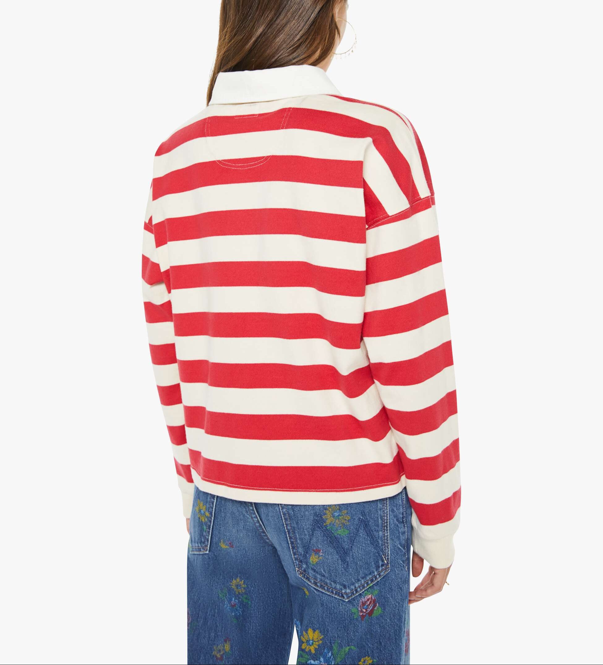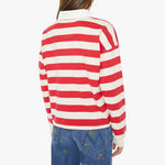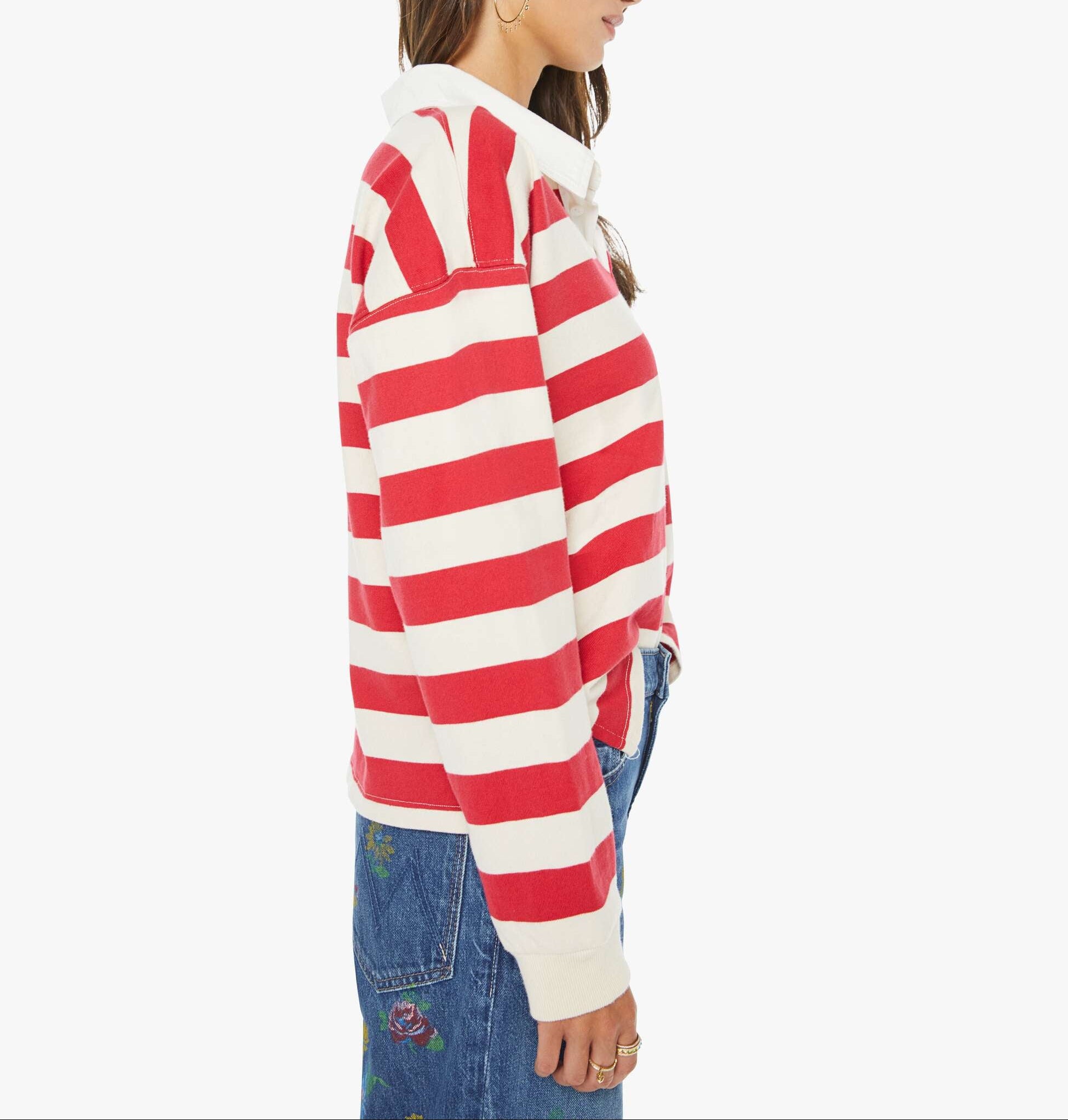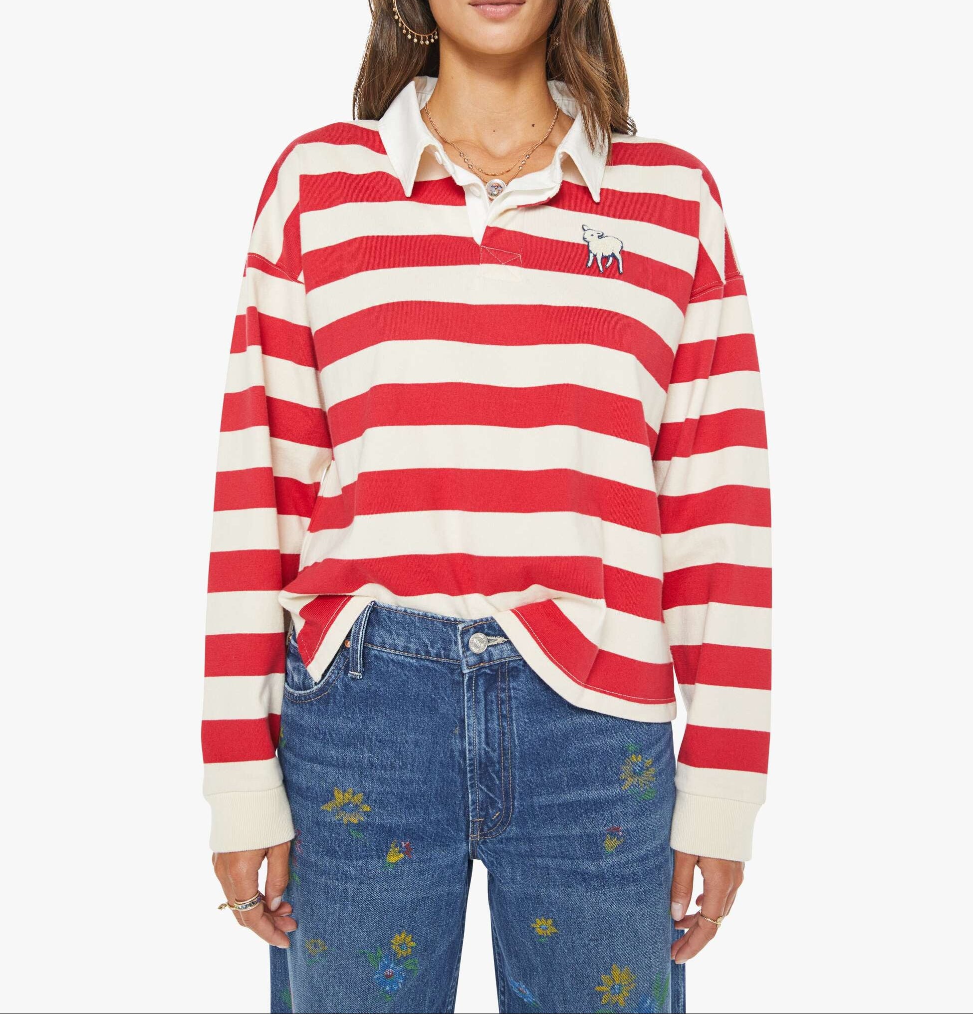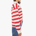 Mother The Boxy Match in Going The Distance. MOTHER's take on the rugby shirt features drop shoulders and an oversized fit. Made from a recycled cotton blend, the top is designed in off-white and red stripes with a fuzzy lamb patch on the chest.