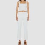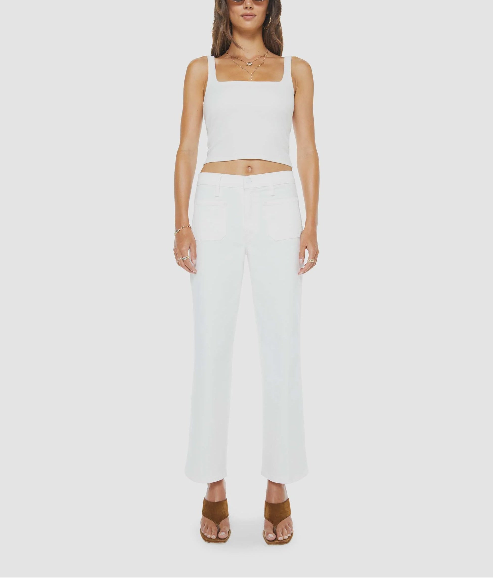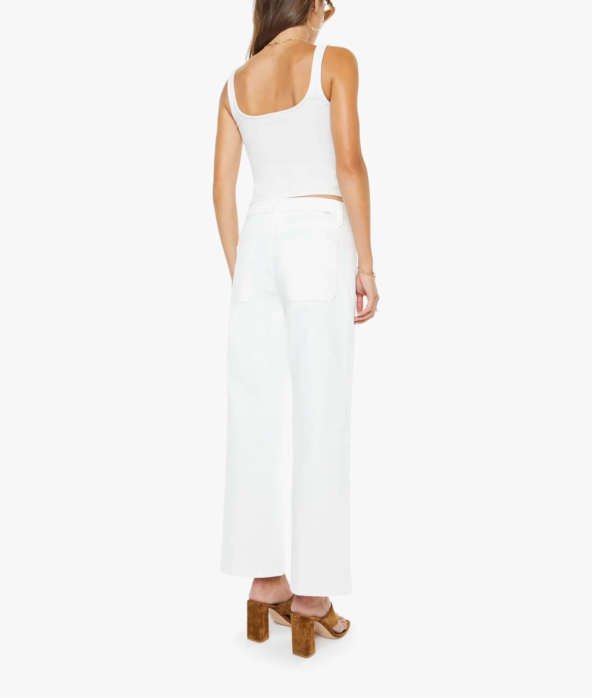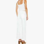 Mother The Patch Pocket Mid Rise Maven Ankle in Totally Innocent. MOTHER's in the clear. Mid-rise jeans with a loose fit, zip fly, wide leg, patch pockets and ankle-length inseam with a clean hem. Cut from semi-rigid SUPERIOR denim, Totally Innocent is a classic white with tonal hardware.
