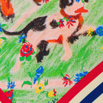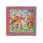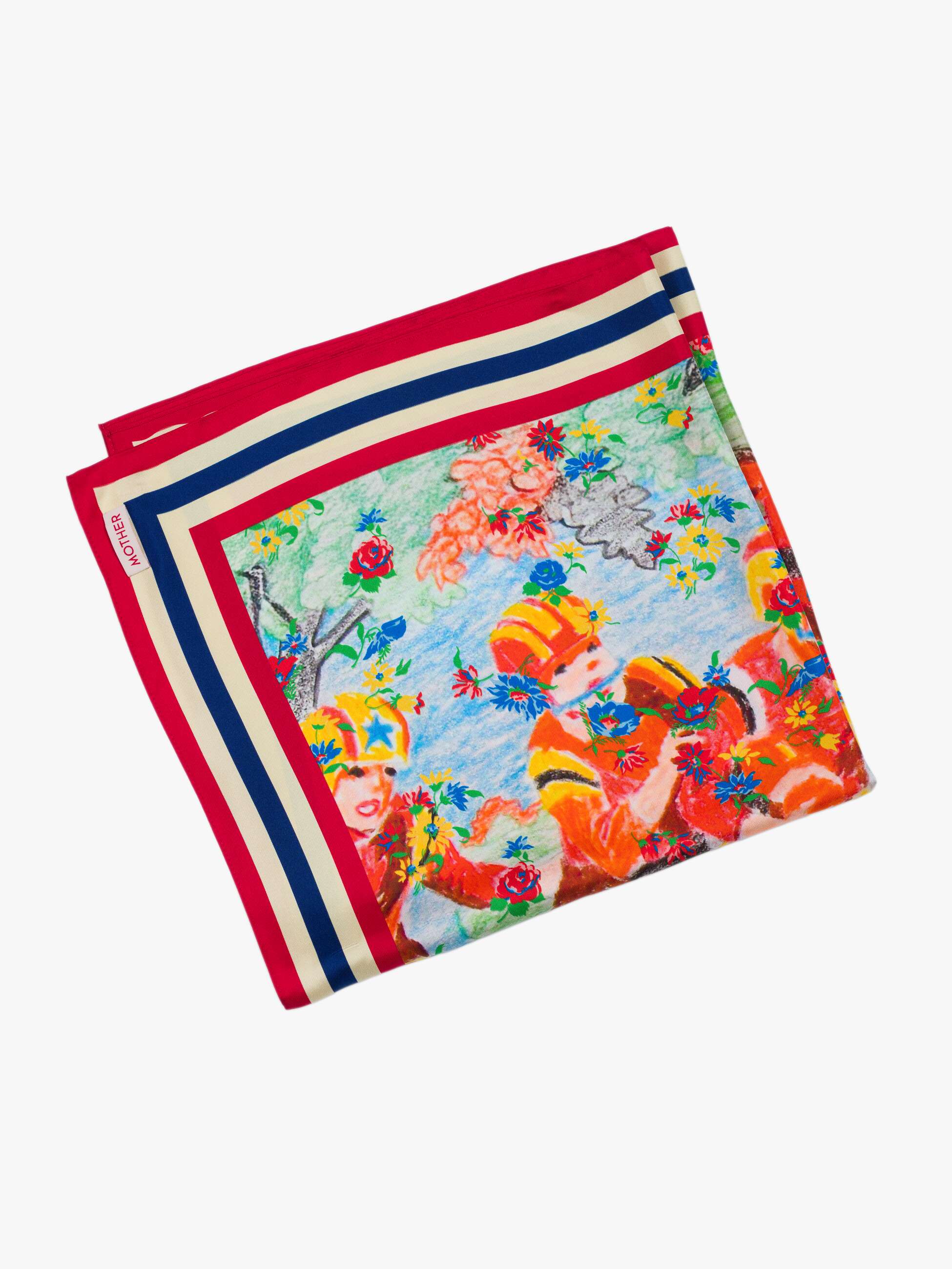 Mother The Scarf It Down in Fumbling. Don't drop the ball. A 25" square scarf made from 100% silk with a football-inspired graphic and red, white and blue striped trim.