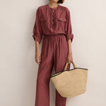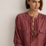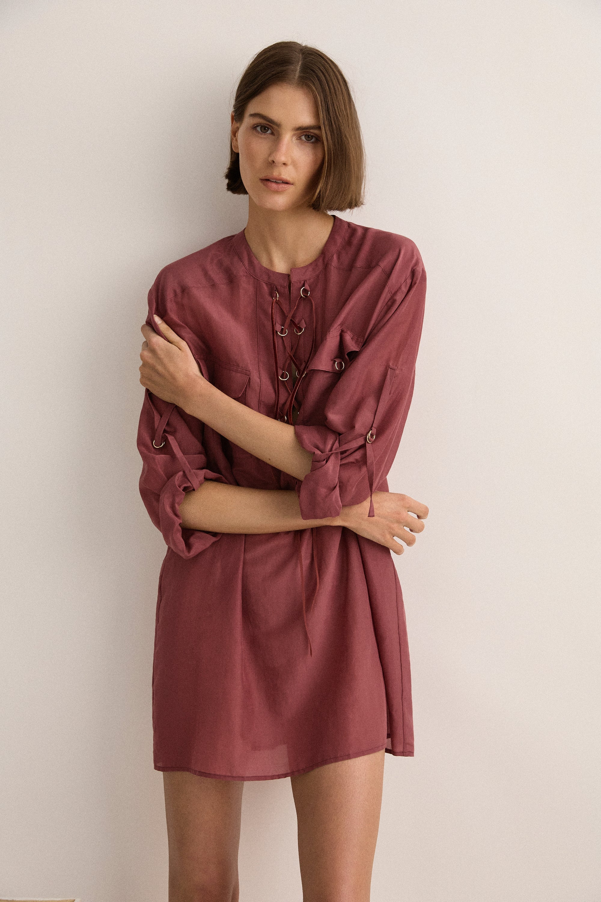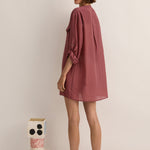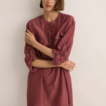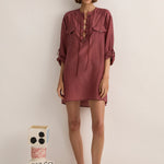 The Sarah-Jane Clarke Eyelet Kaftan in Plum. The Eyelet Kaftan is cut in a silk-cotton blend. Features include a round neck with eyelet detail and oversized pockets. Versatile length that can be worn as a mini over swim or tucked into our straight pant.