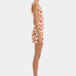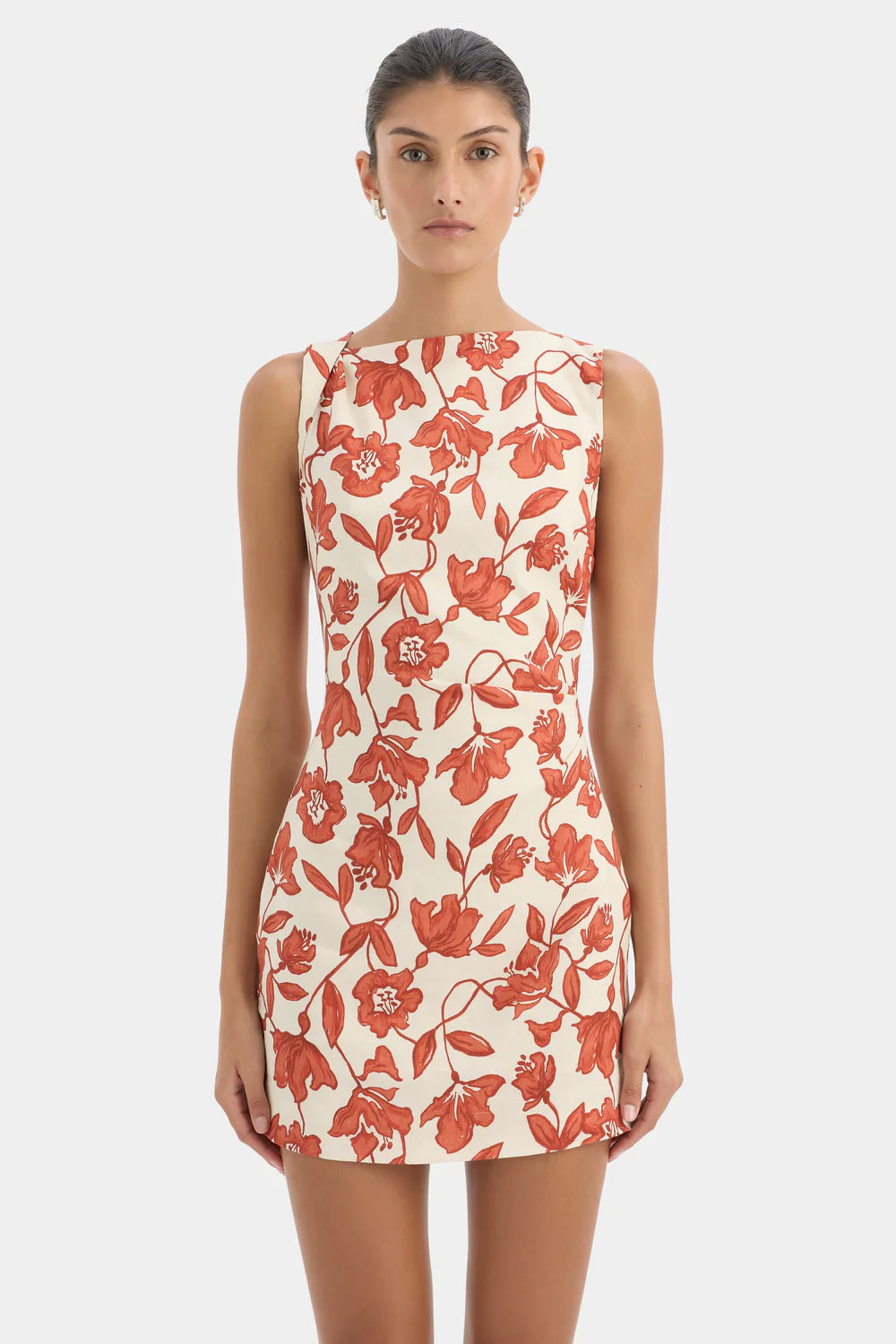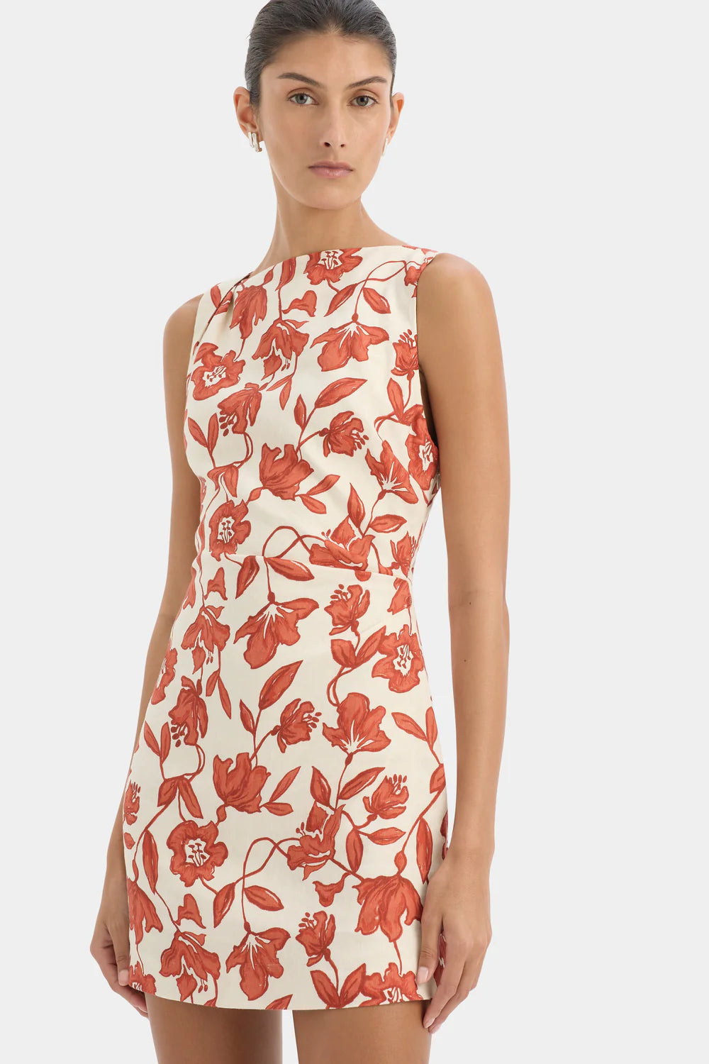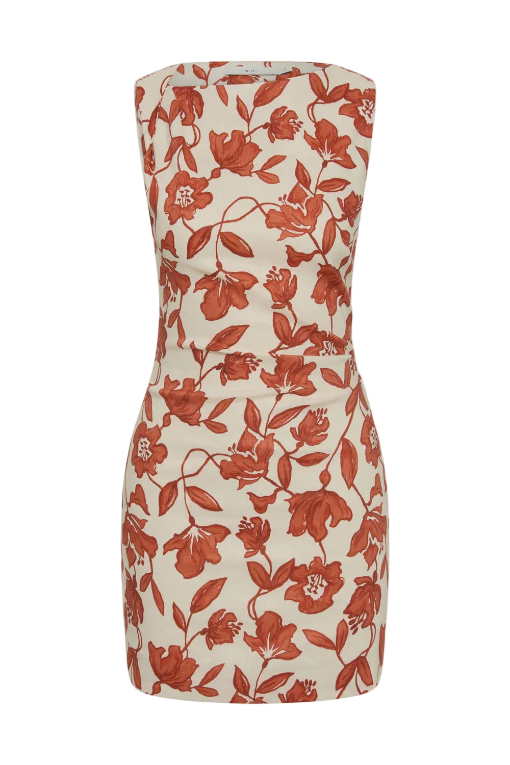 Sir Chloe Mini Dress in Tuileries. The Chloe Mini Dress in Tuileries is crafted from a linen-viscose fabrication with slight stretch. It features a straight neckline, fixed twist detail at the shoulder, and soft tucks through the body for an elegant shape. Fully lined and finished with an invisible side zipper and printed with a SIR. exclusive, hand painted ditsy floral print.
