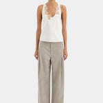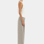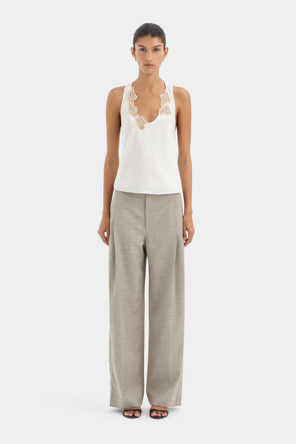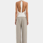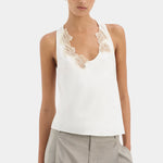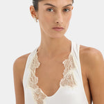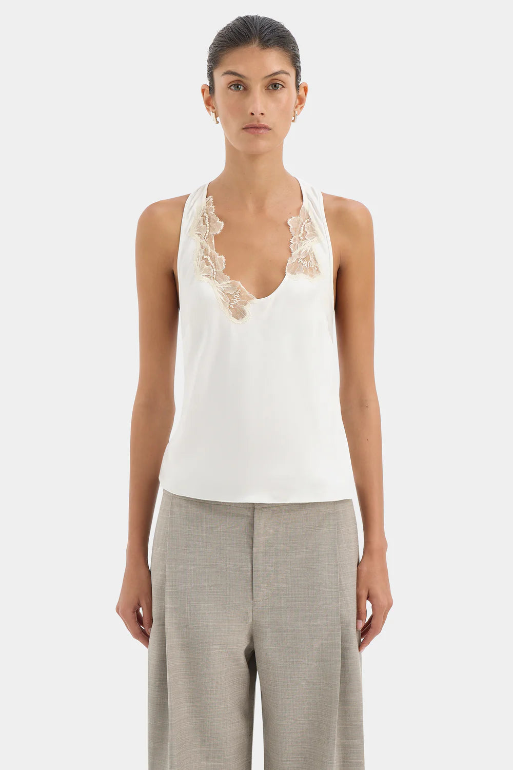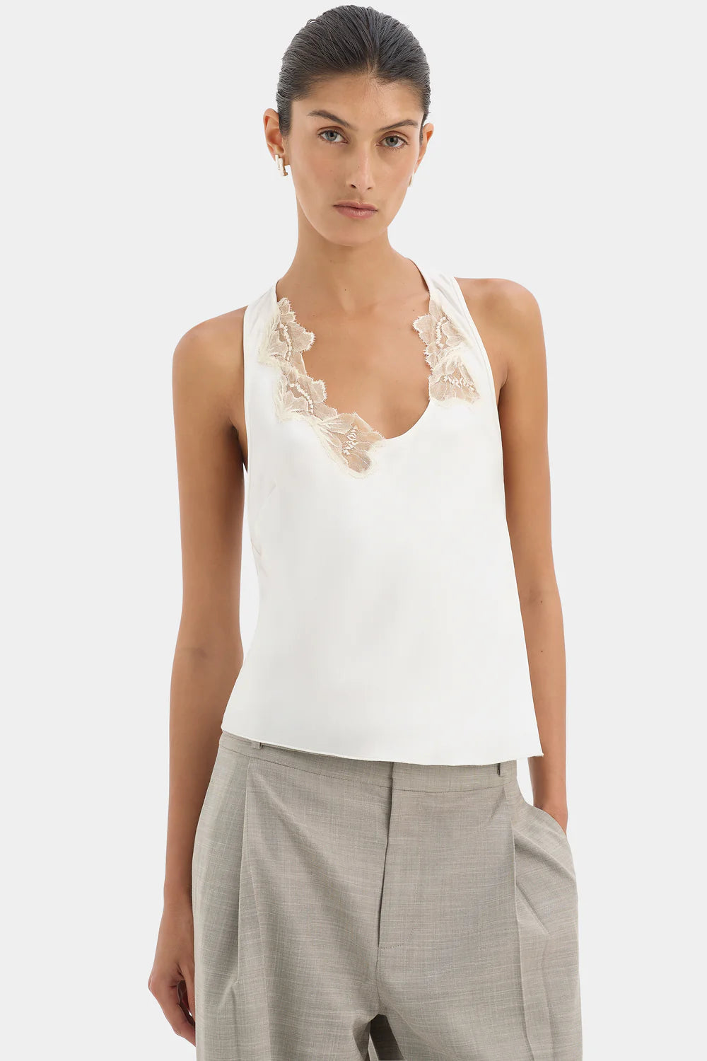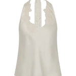 Sir Montparnasse Halter Top in Ivory Lemon. The Montparnasse Halter Top in Ivory Lemon channels 90’s Parisian minimalism with a soft, feminine edge. Crafted from silk crepe de chine with a matte finish for fluid, effortless drape. It features a halter neckline with Japanese placement lace, individually stitched for a refined, considered finish, a low back and tie neck.