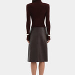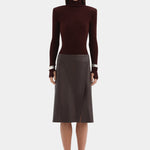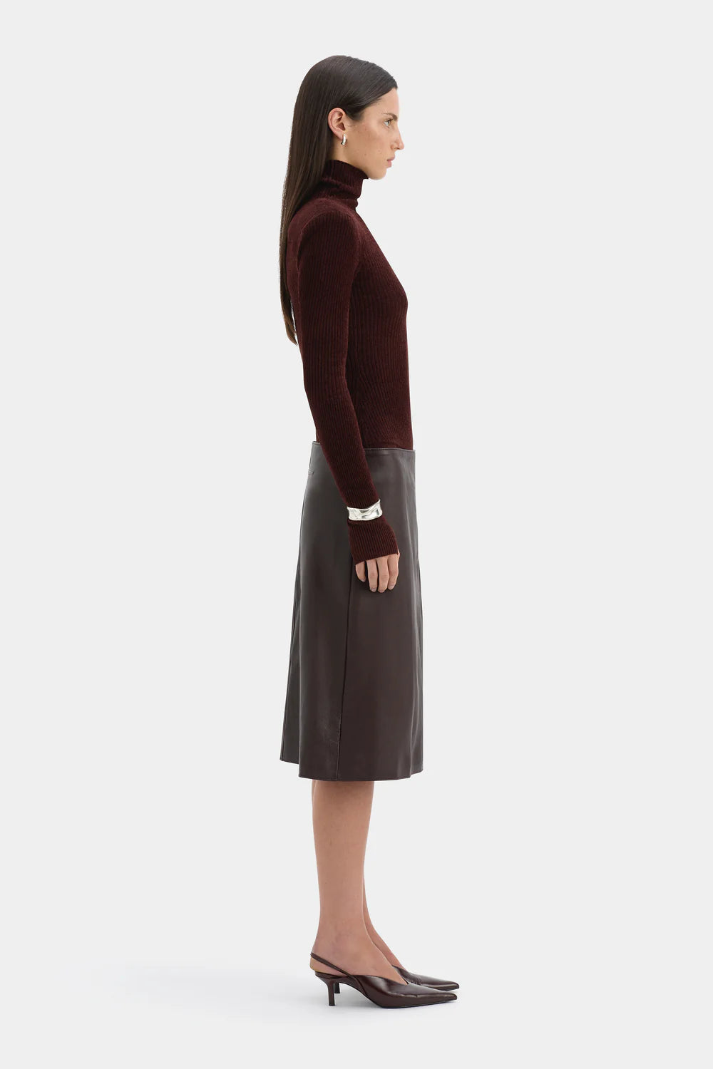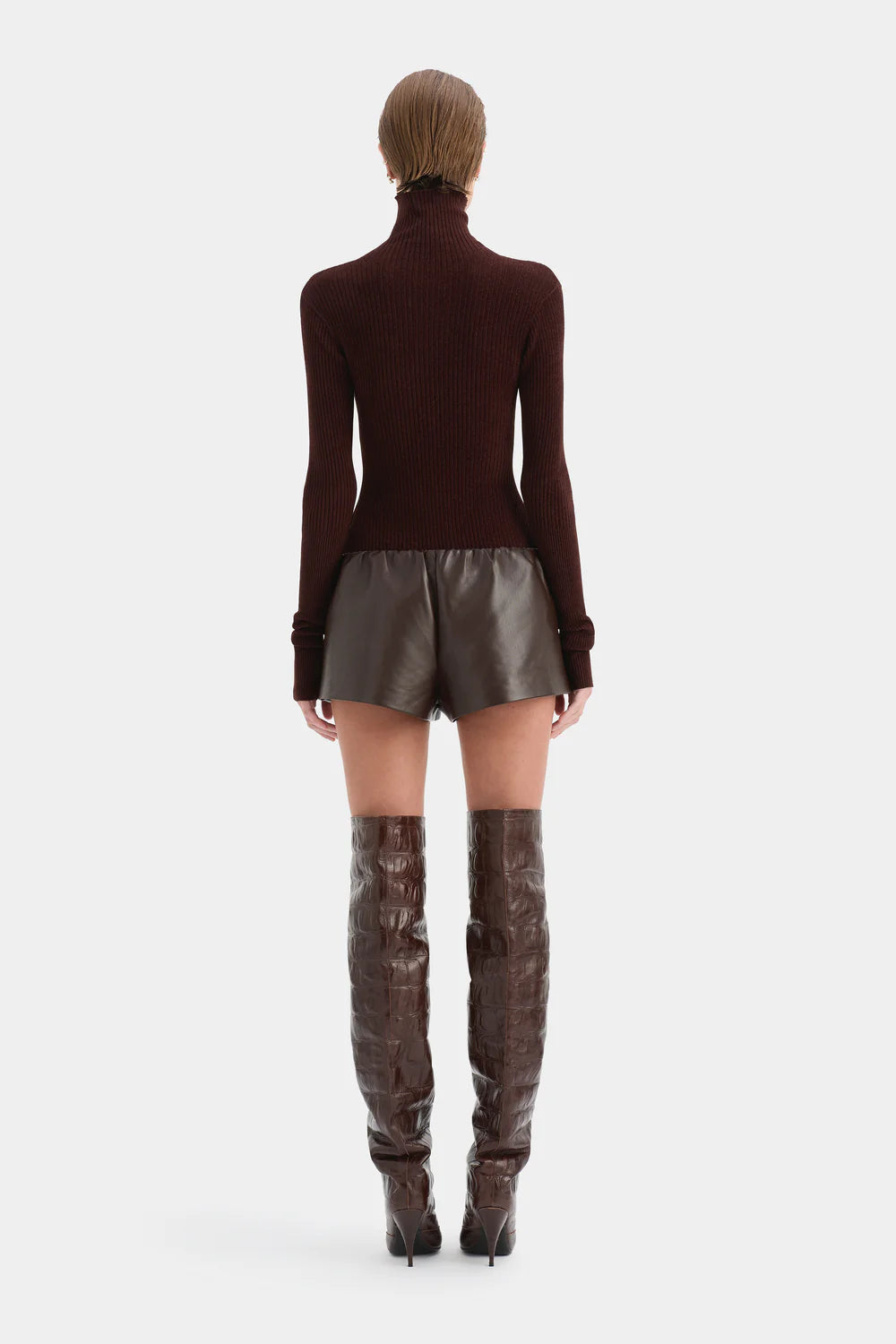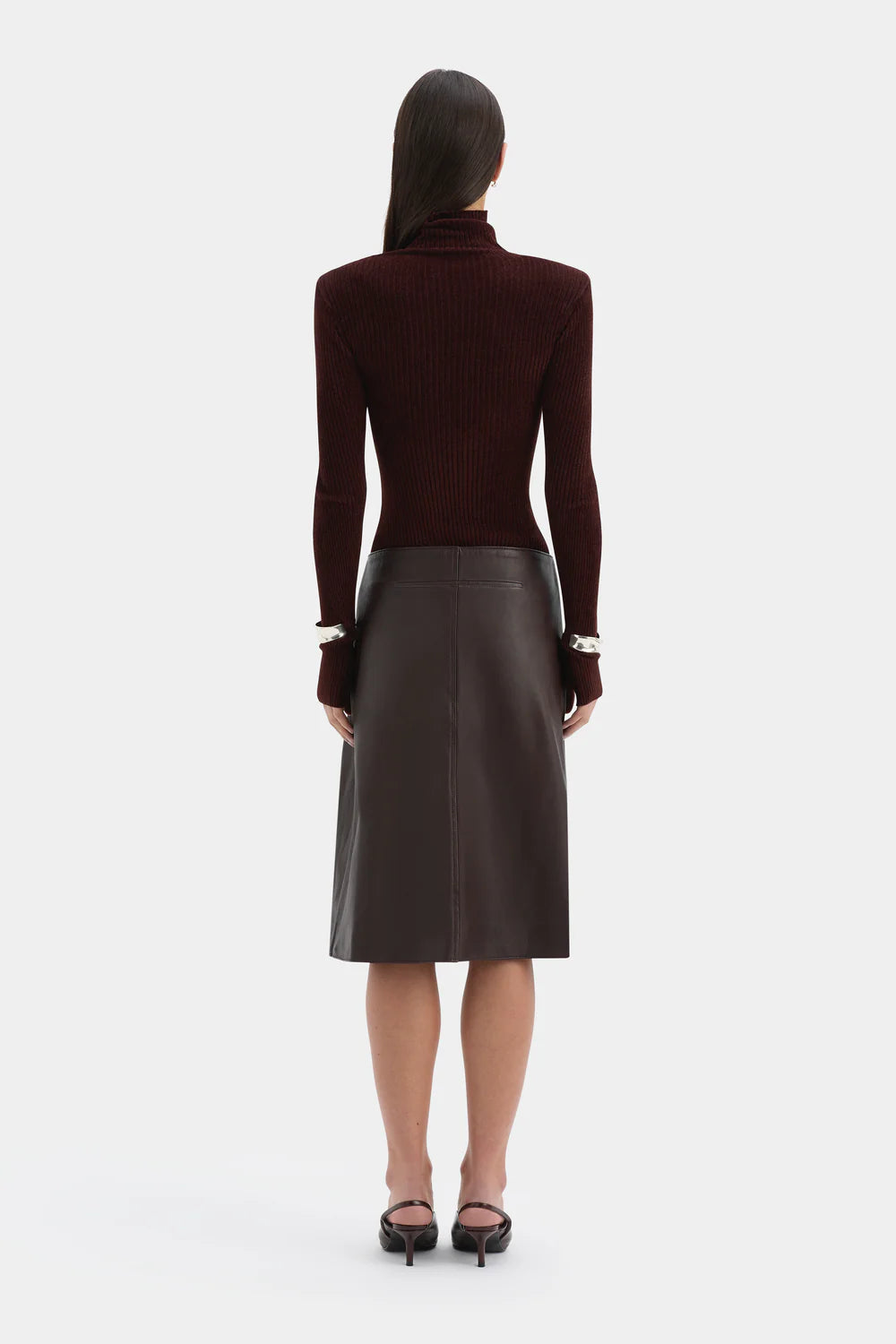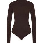 Sir Violetta Bodysuit in Plum. The Violetta Bodysuit in Plum is crafted from a plush velour knit fabrication that combines sustainable recycled nylon with a luxurious, ribbed finish. A form-fitting silhouette, featuring a turtleneck and long sleeves with functional thumb holes for added warmth and press snaps at the crotch.