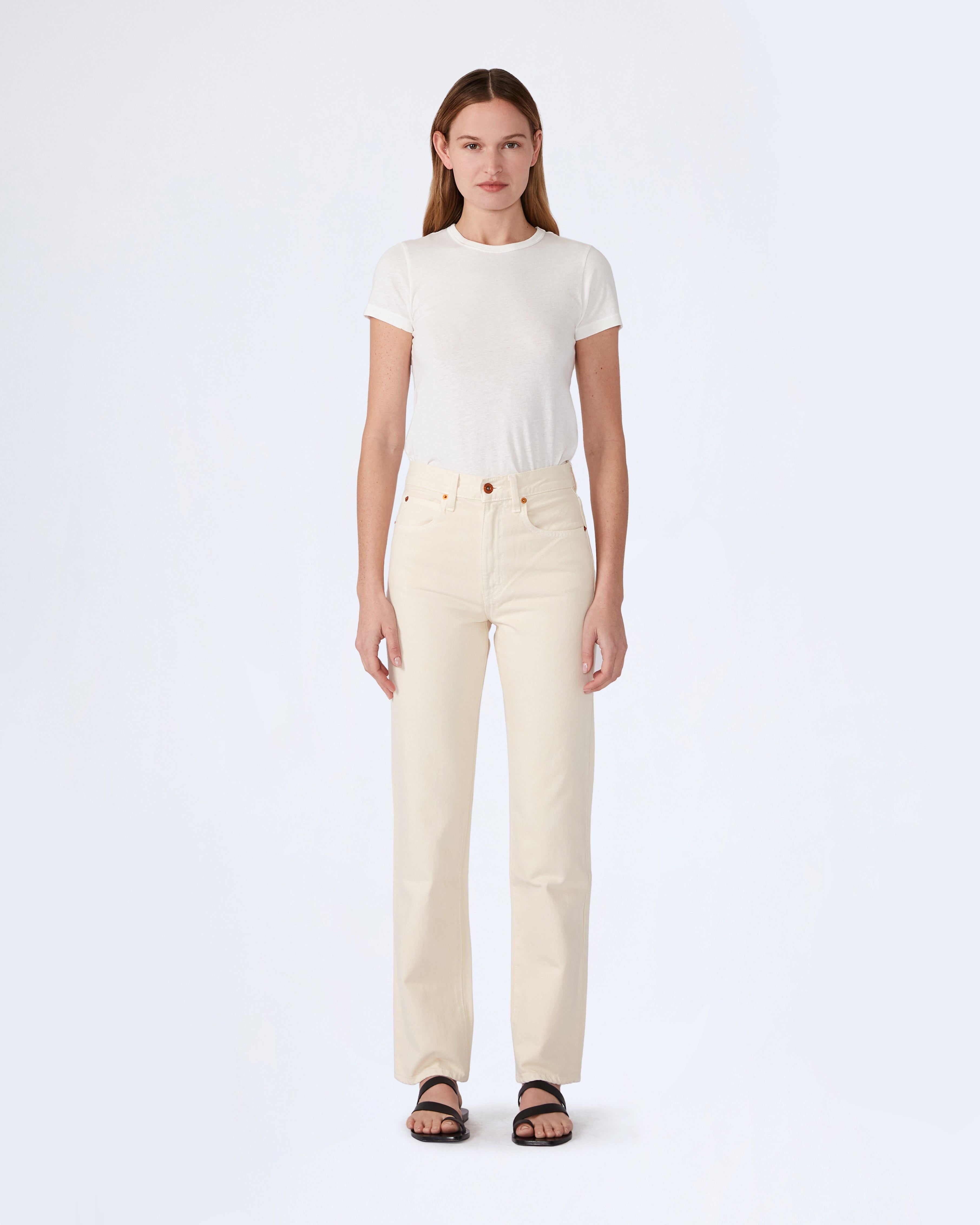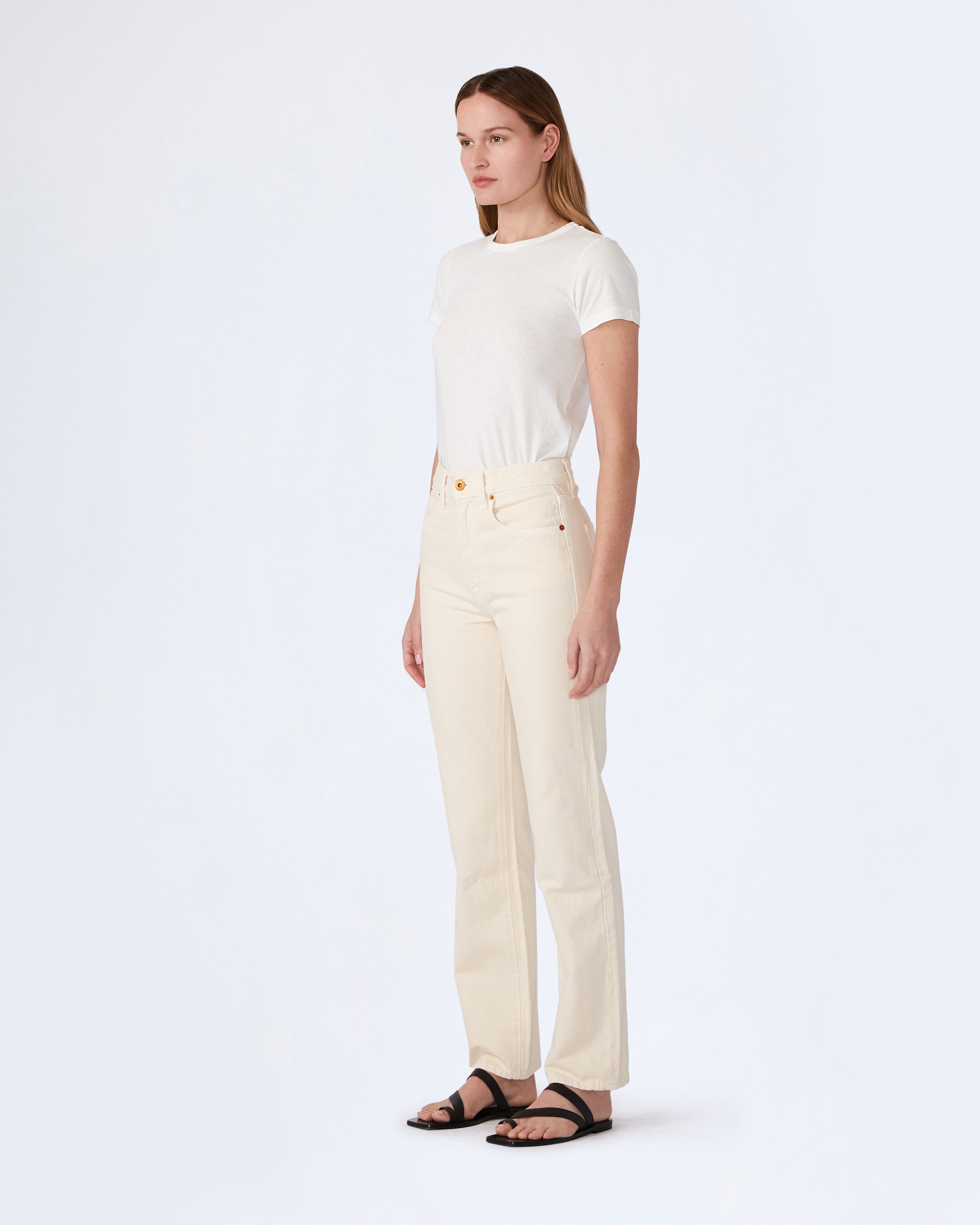 SLVRLAKE London Jean in Ecru. This signature style is designed to fit and flatter the feminine form, visually elongating the leg with a straight leg silhouette and high rise.