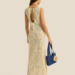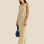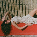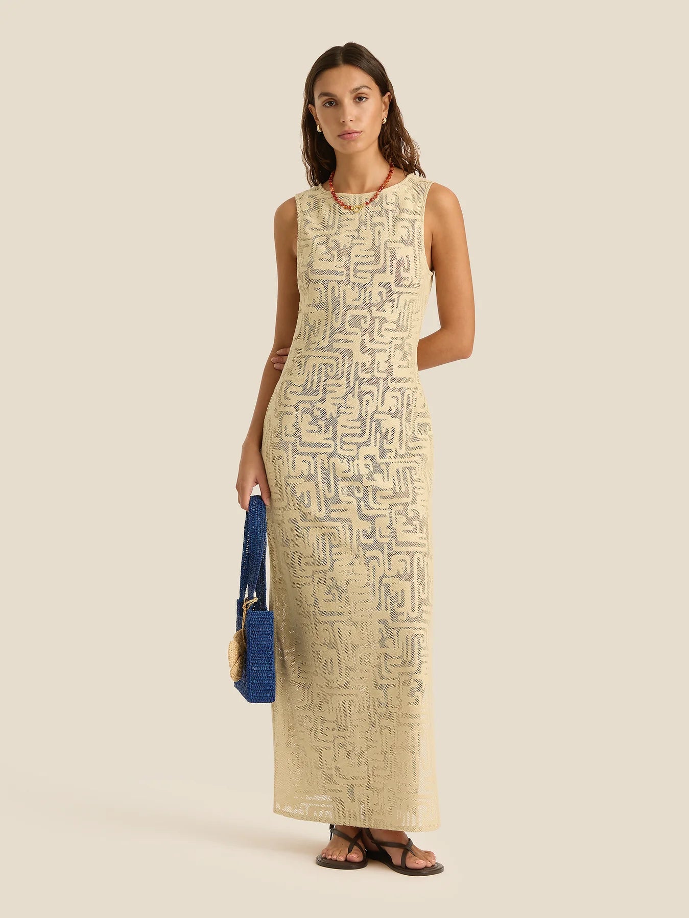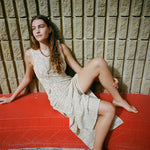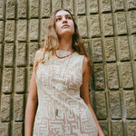 Soleil Soleil Carmen Dress in Kin. A dress that will drift easily from lunch to late afternoon. Crafted from custom-embroidered cotton netting, the Carmen Dress is a sheer take on a timeless bias-cut silhouette. Said to inspire optimism, natural yellow jade beads conclude the back neck tie closure.