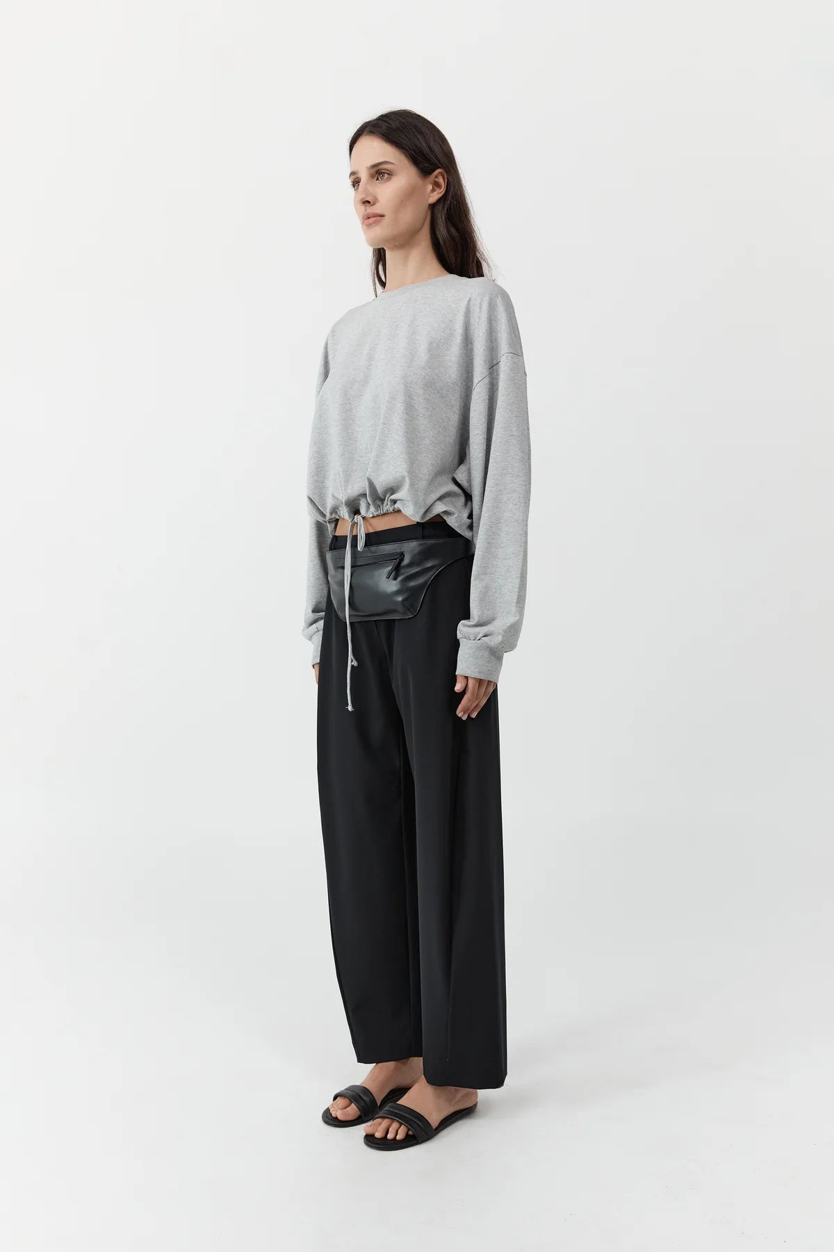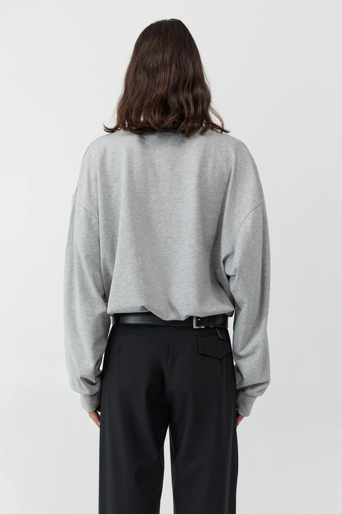 St Agni Drawstring Long Sleeve Top in Light Grey Marle. Cut from 100% cotton, the Drawstring Long Sleeve Top is designed to layer seamlessly. A clean crew neckline is finished with ribbed detailing, echoed at the cuffs. Dropped shoulders and a boxy silhouette create a relaxed feel, while an adjustable drawcord at the hem allows the shape to be cinched or worn loose.