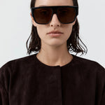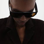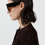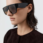 St Agni Linea Oversized Sunglasses in Black and Brown. Where statement meets sophistication, the Linea Oversized Sunglasses showcase a striking flat-top D-frame and thick fin-shaped temples for a contemporary edge. Accented with sleek silver hardware and fitted with mineral glass lenses. Each pair arrives with a cleaning cloth and a signature St. Agni case.
