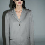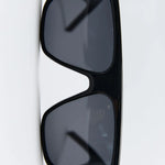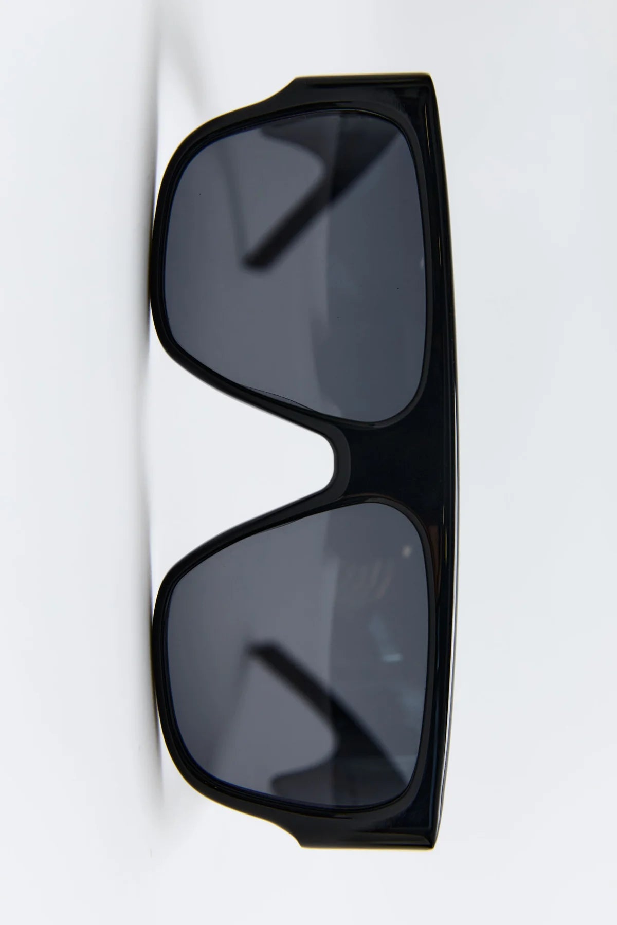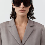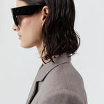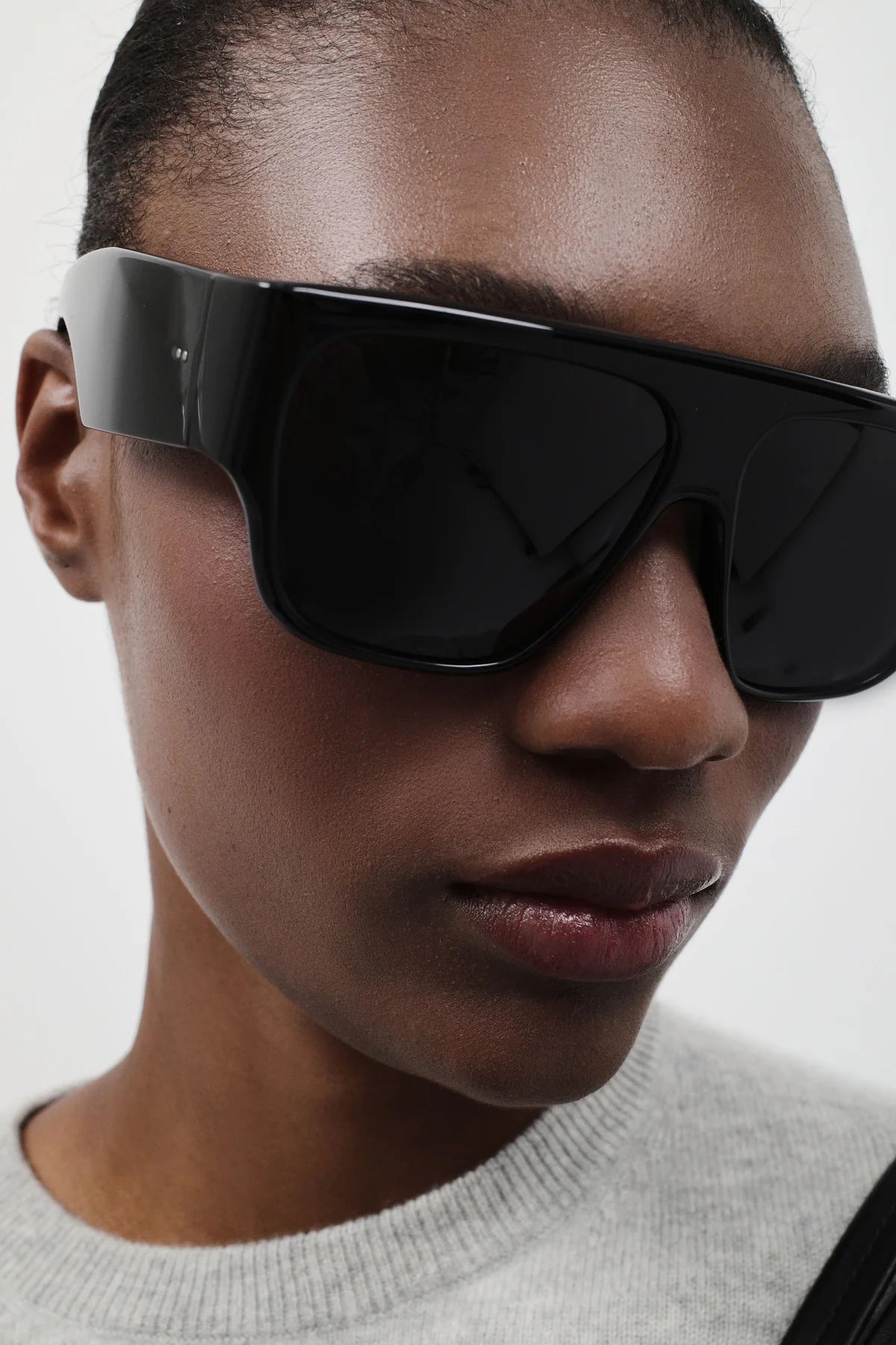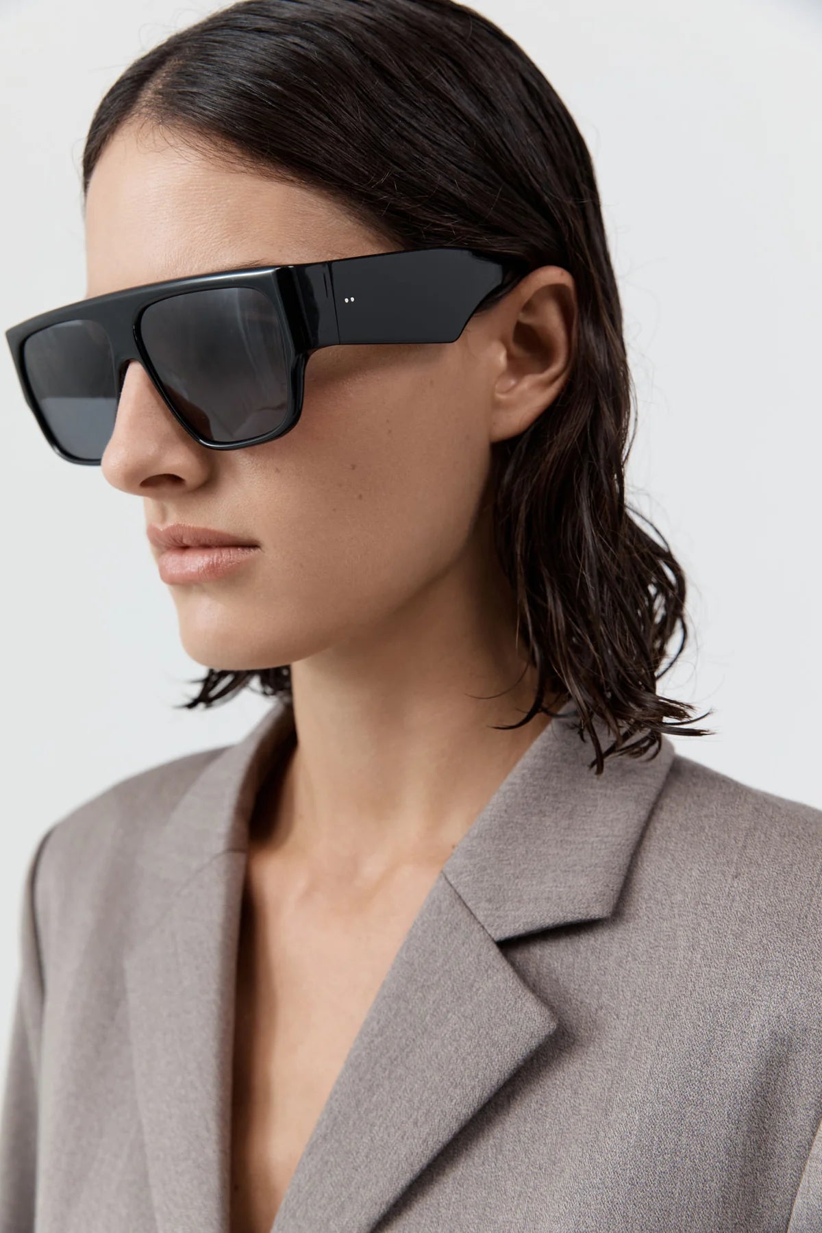 St Agni Linea Oversized Sunglasses in Black and Grey. Where statement meets sophistication, the Linea Oversized Sunglasses showcase a striking flat-top D-frame and thick fin-shaped temples for a contemporary edge. Accented with sleek silver hardware and fitted with mineral glass lenses. Each pair arrives with a cleaning cloth and a signature St. Agni case.
