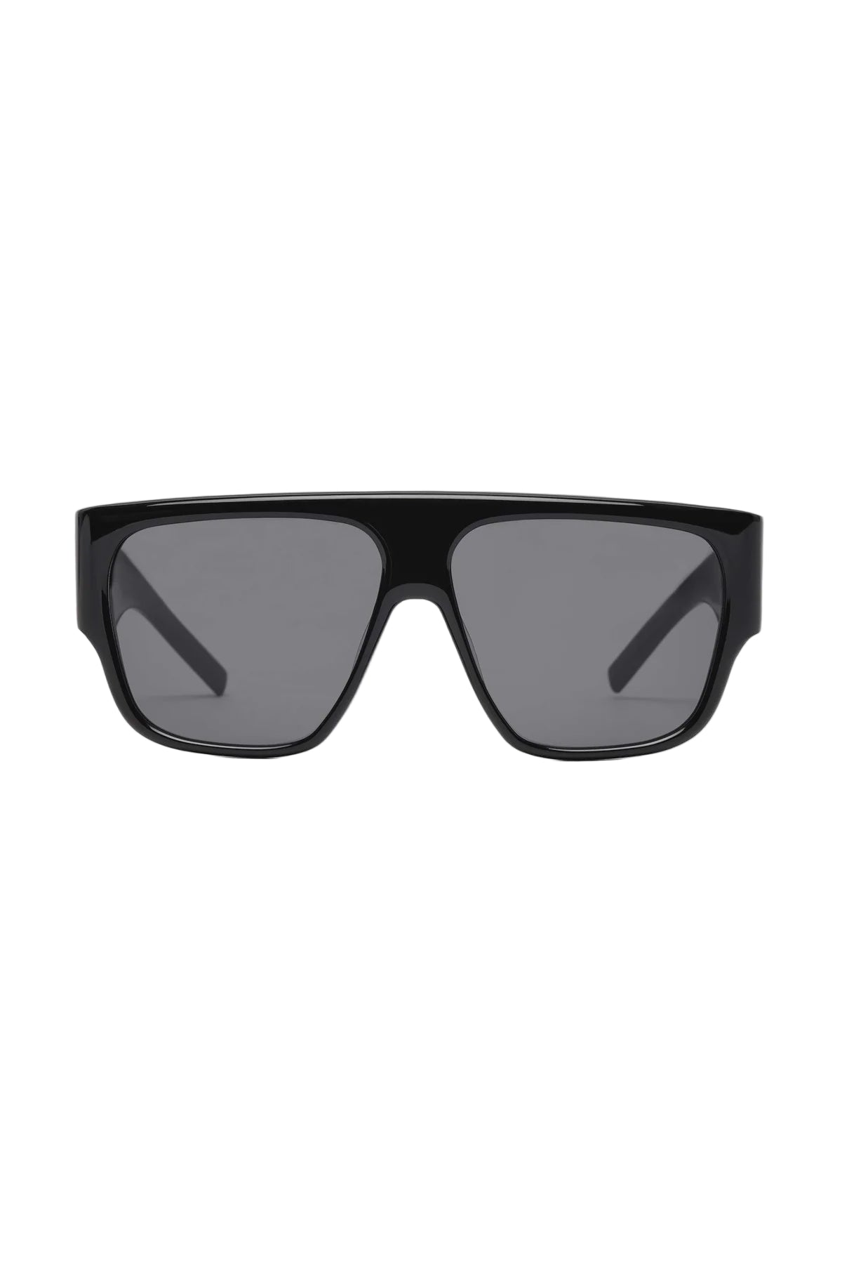 - Flat top D-frame, oversized, thick fin-shaped temples, silver hardware