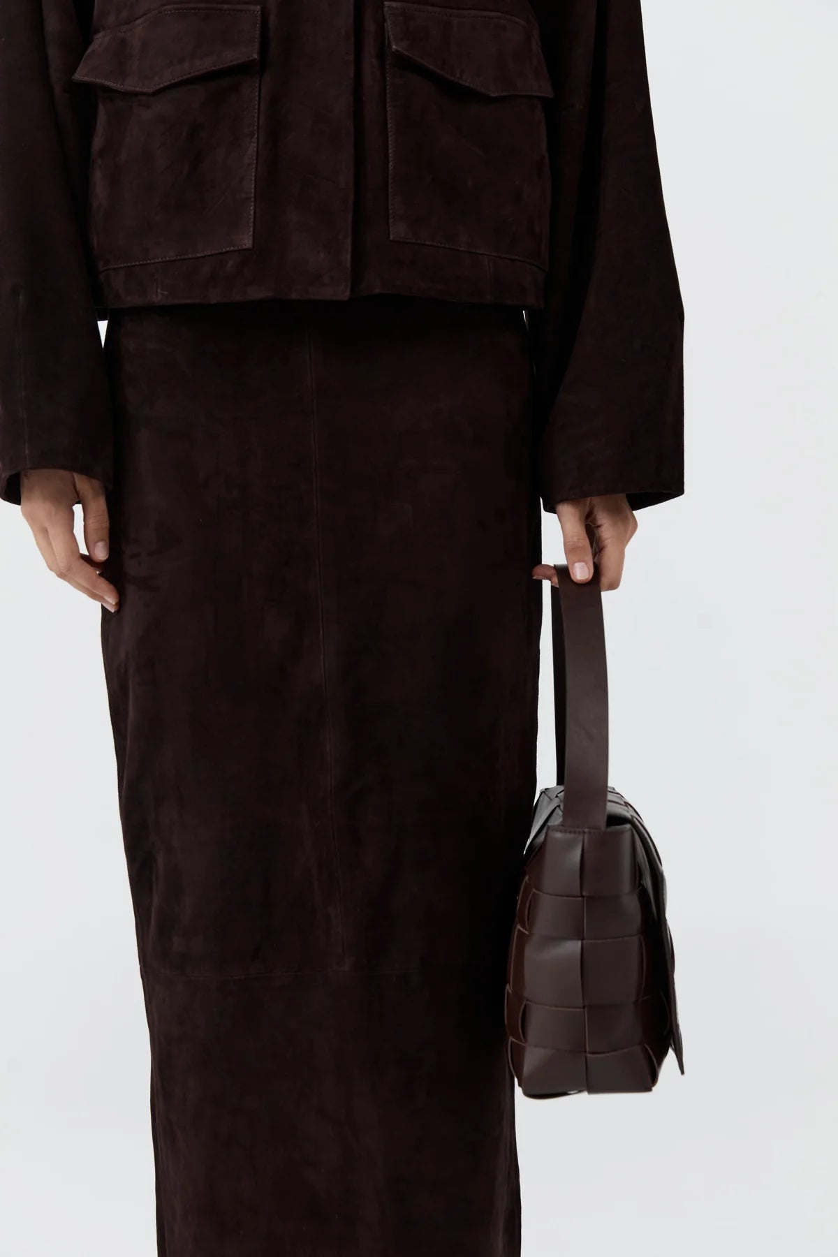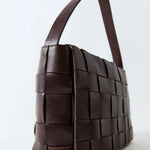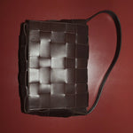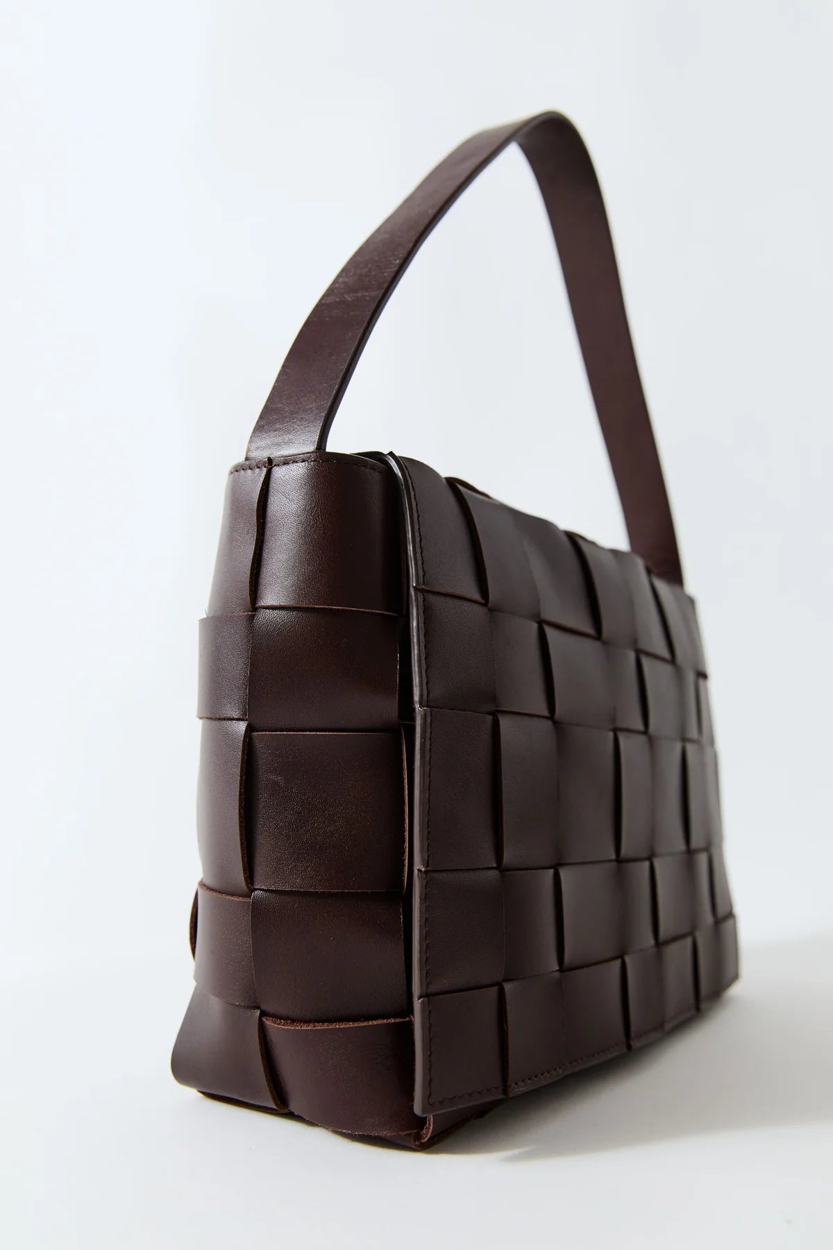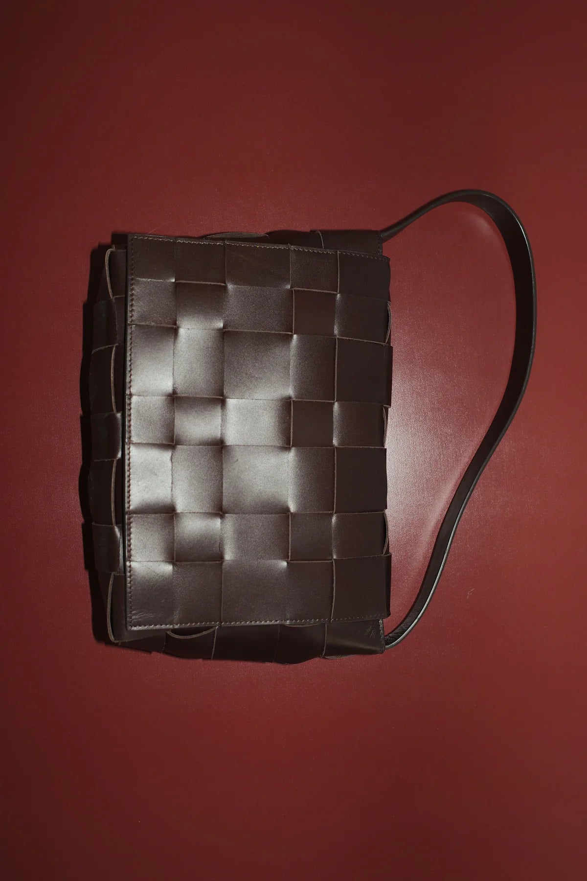 St Agni Woven Envelope Mini Tote in Chocolate. Designed to carry your daily essentials, the Woven Envelope Mini Tote features a structured envelope inspired silhouette with a woven body and flap closure secured by a hidden magnetic fastening. The cotton-lined interior includes an internal pocket for added practicality. The Woven Envelope Mini is the perfect accompaniment to both casual looks and occasion wear.