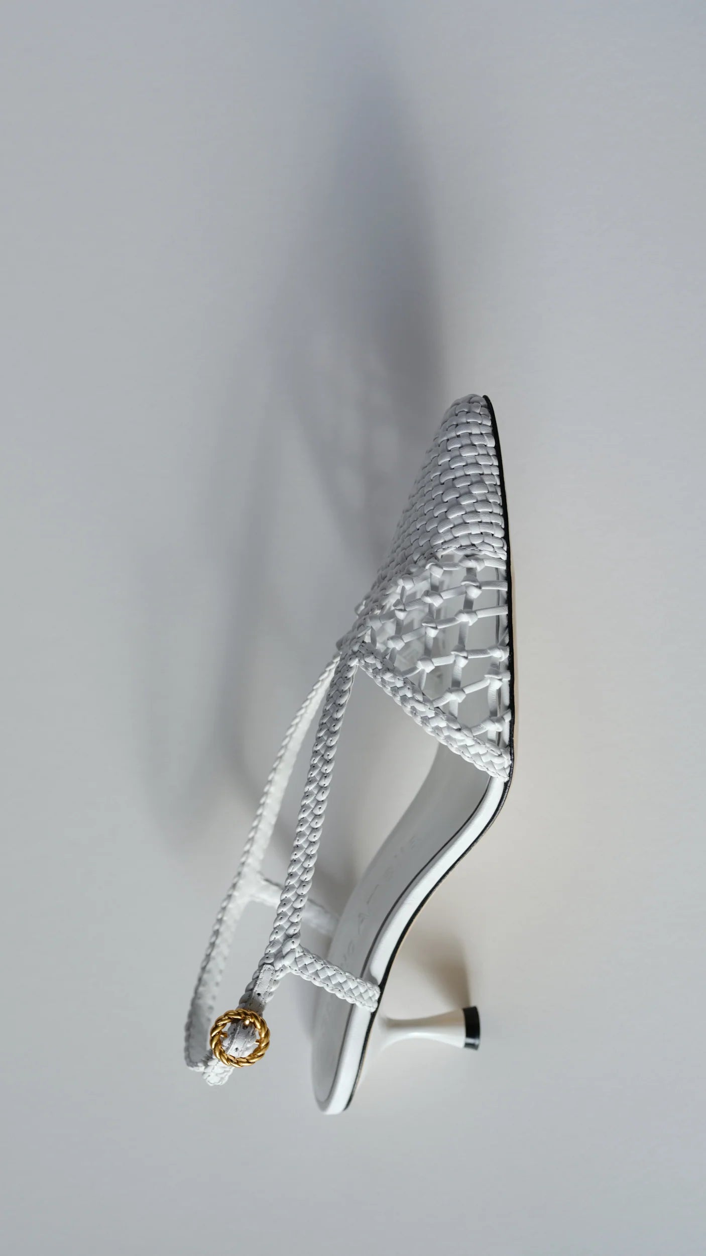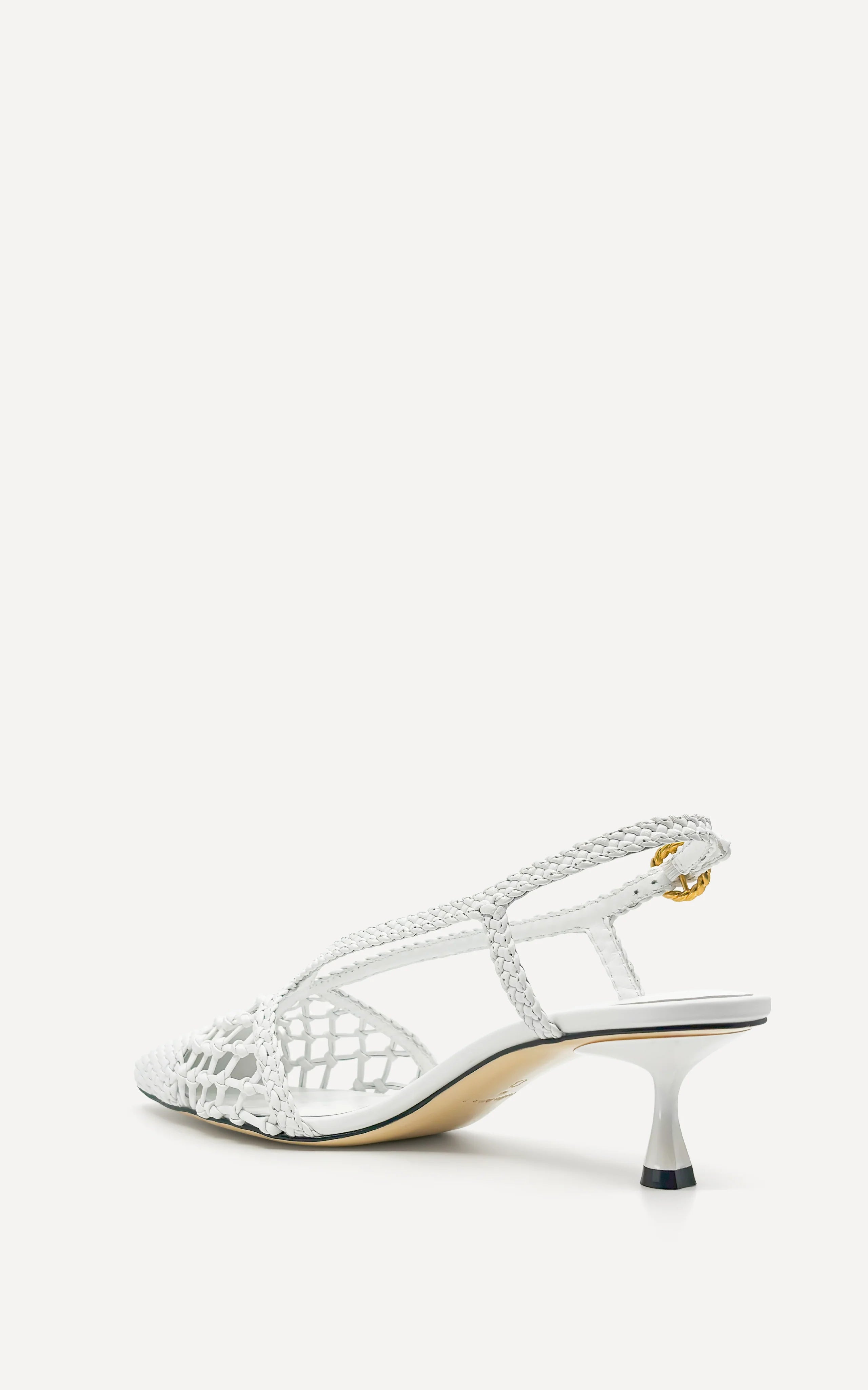Created from Chrome-Free Nappa Leather, the Nexus 50 Heel is features a woven leather upper with intricate cut outs of hand tied knots. The silhouette features an elongated soft pointed toe with a halter slingback strap finished with our custom made Helix Buckle.