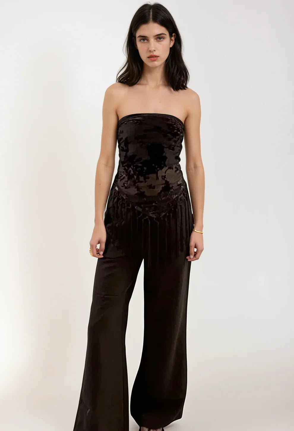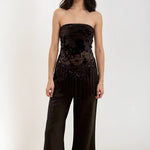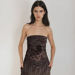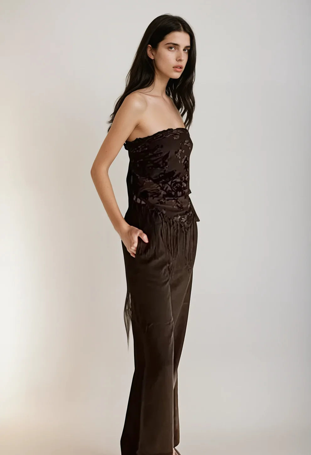 Tohen Astley Scarf in Dark Maple. A refined addition to the modern wardrobe, this devoré scarf in dark maple is cut in a fluid triangle silhouette and crafted from delicate burnout fabric with a soft, semi-sheer finish. Lightly fringed and finished with tactile tassels, it moves effortlessly with the body, designed to be styled multiple ways: draped over the shoulders, wrapped at the waist, or knotted at the neck. Lightweight yet considered, it offers subtle texture and timeless versatility.