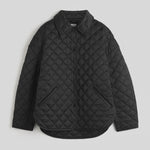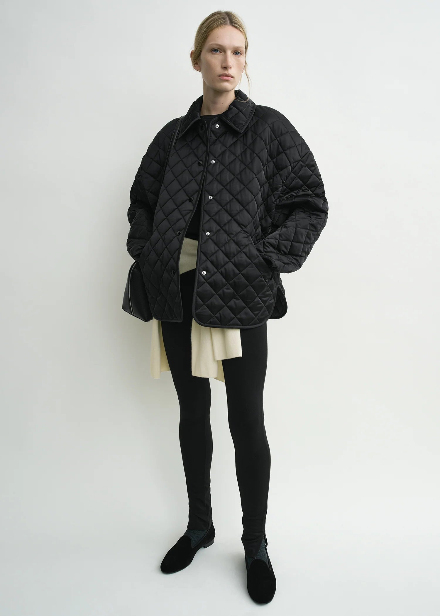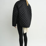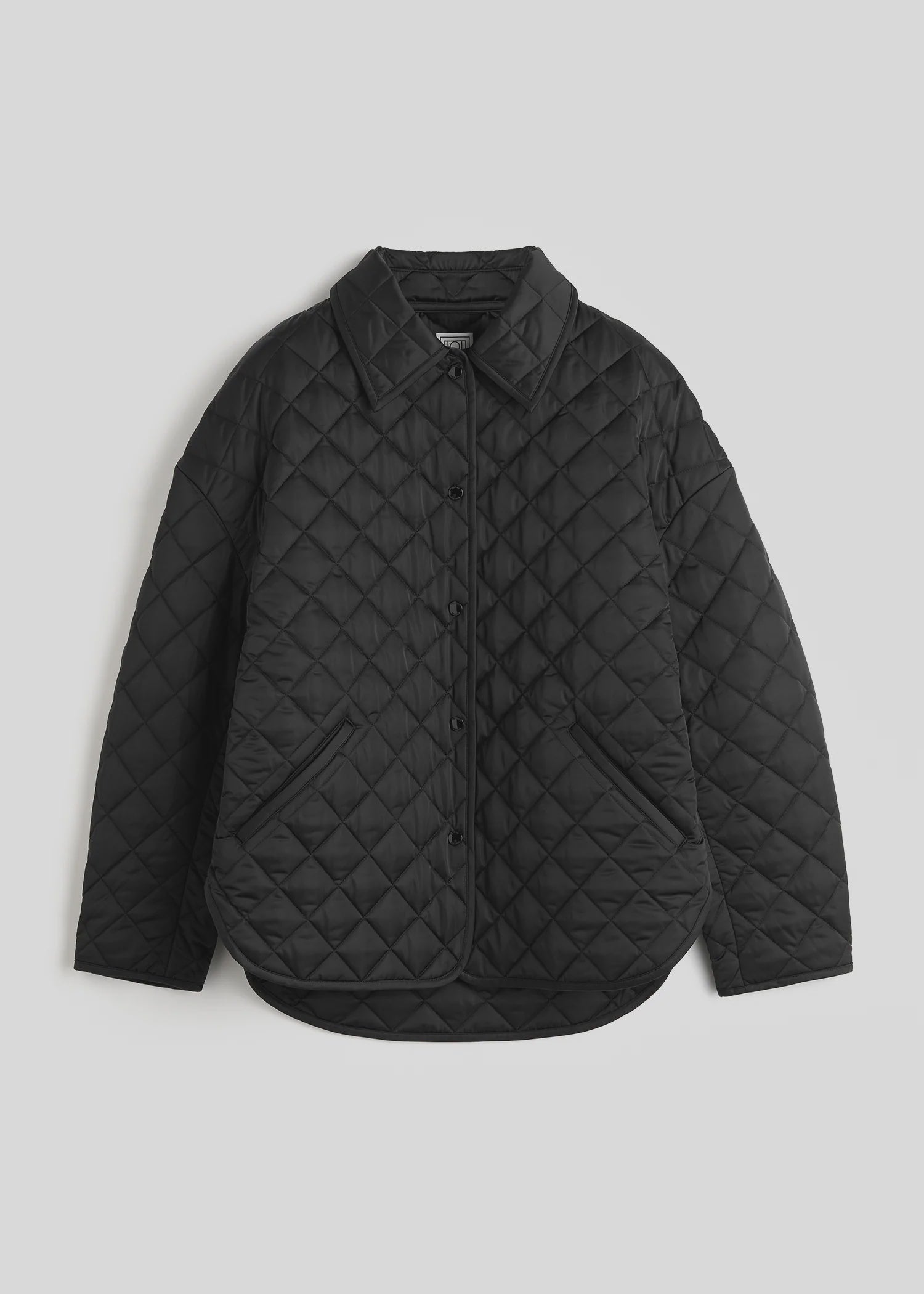 Toteme Collared Quilted Jacket in Black. Designer's note: "We gave our emblematic quilted jacket a slight silhouette update in this Garderob piece, adding a neat collar and elongating the body and sleeves for a more dramatic A-line silhouette."