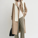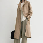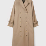 Toteme Signature Trench in Khaki. Signature TOTEME trench coat defined with an oversized silhouette that fastens with neat horn buttons along the double-breasted front. It is made from durable and water-repellent cotton-blend gabardine and finished with adjustable leather-buckled cuff straps and welt pockets. Wear it unbuttoned to show glimpses of the monogram-printed satin lining.